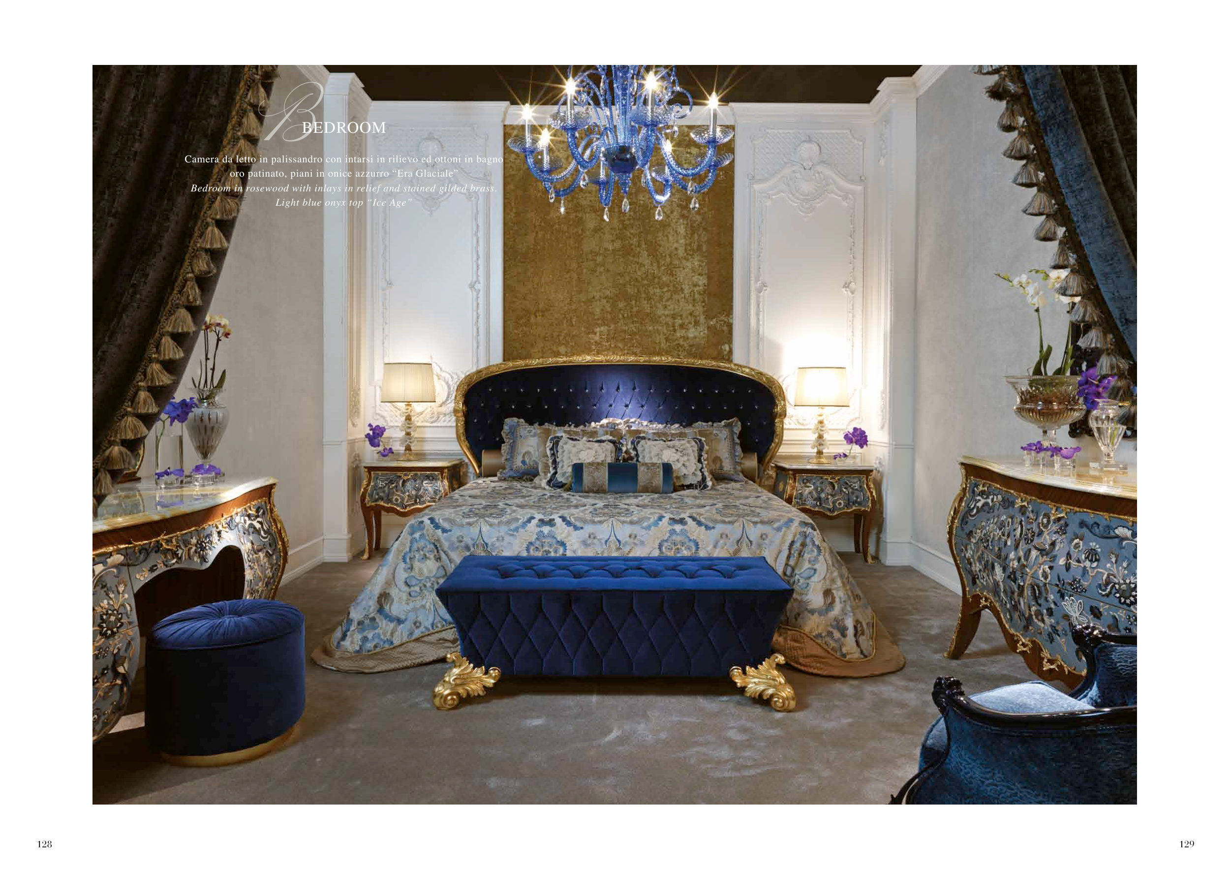 BEDROOM Camera da letto in palissandro con intarsi in rilievo ed ottoni in bagno oro patinato, piani in onice azzurro “Era Glaciale” Bedroom in rosewood with inlays in relief and stained gilded brass. Light blue onyx top “Ice Age” 128 129
