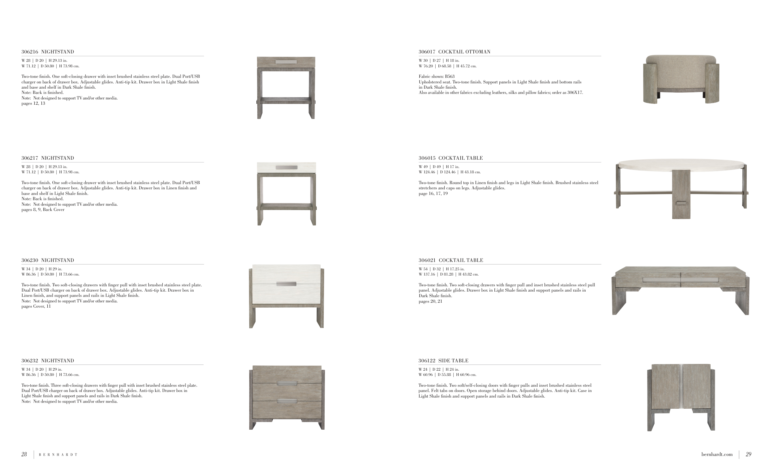 Two-tone finish. One soft-closing drawer with inset brushed stainless steel plate. Dual Port/USB