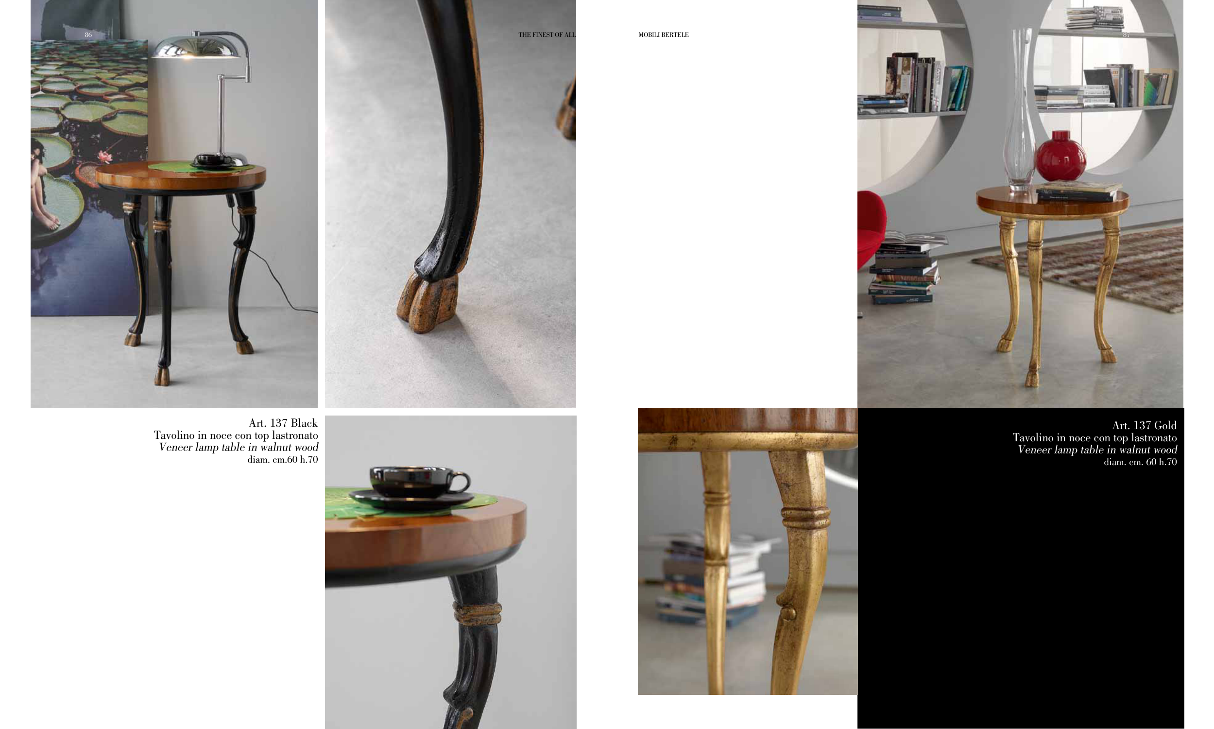 Art. 137 Gold Tavolino in noce con top lastronato Veneer lamp table in walnut wood diam. cm. 60 h.70 Art. 137 Black Tavolino in noce con top lastronato Veneer lamp table in walnut wood diam. cm.60 h.70 87 86 MOBILI BERTELE THE FINEST OF ALL