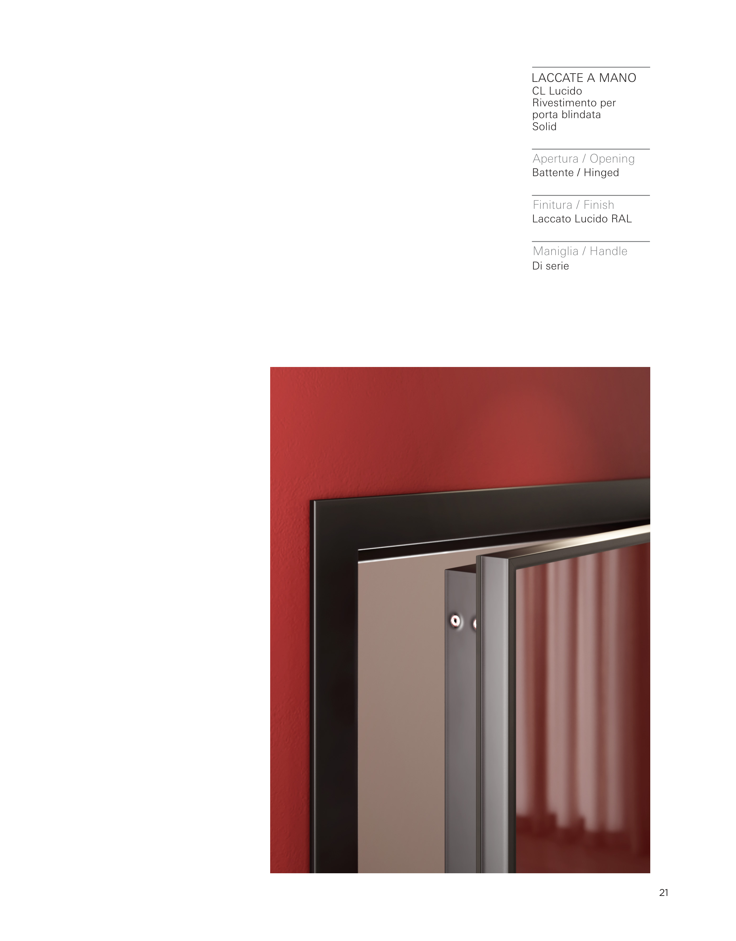 21 CL Lucido Rivestimento per porta blindata Solid Battente / Hinged Laccato Lucido RAL Di serie Apertura / Opening Finitura / Finish Maniglia / Handle LACCATE A MANO