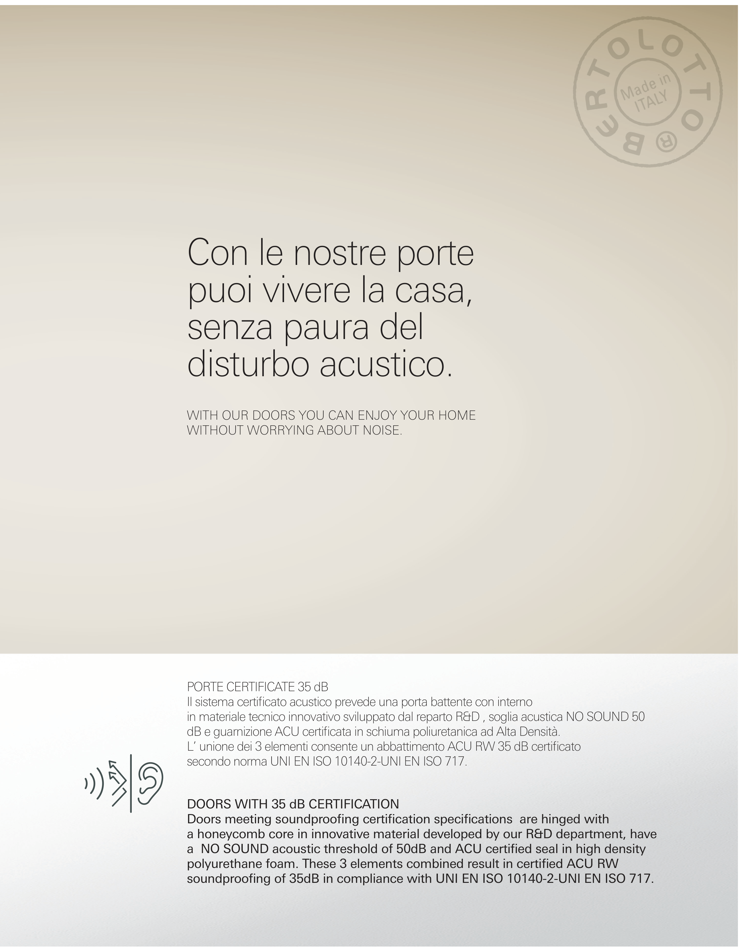 soundproofing of 35dB in compliance with UNI EN ISO 10140-2-UNI EN ISO 717.