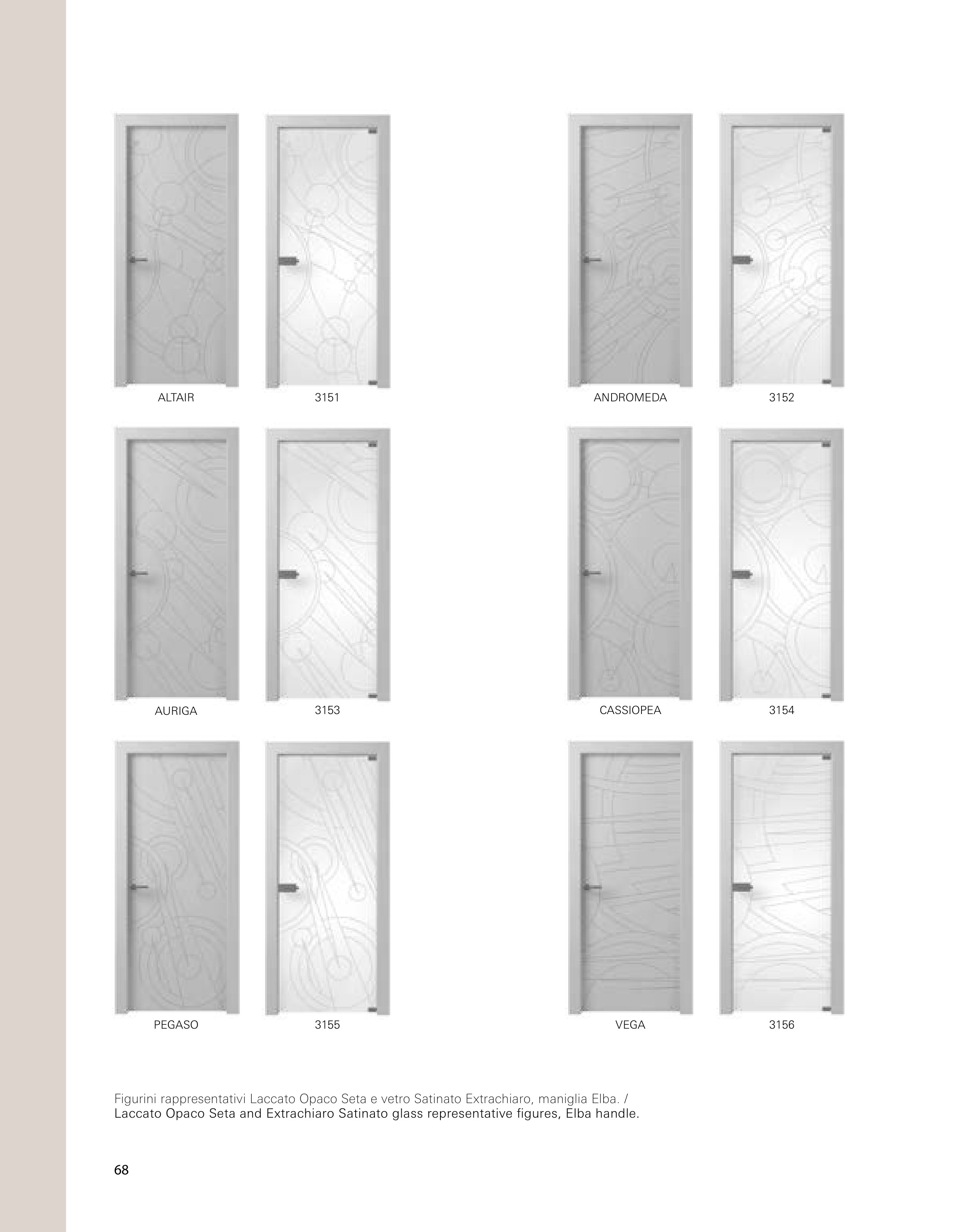 Figurini rappresentativi Laccato Opaco Seta e vetro Satinato Extrachiaro, maniglia Elba. /