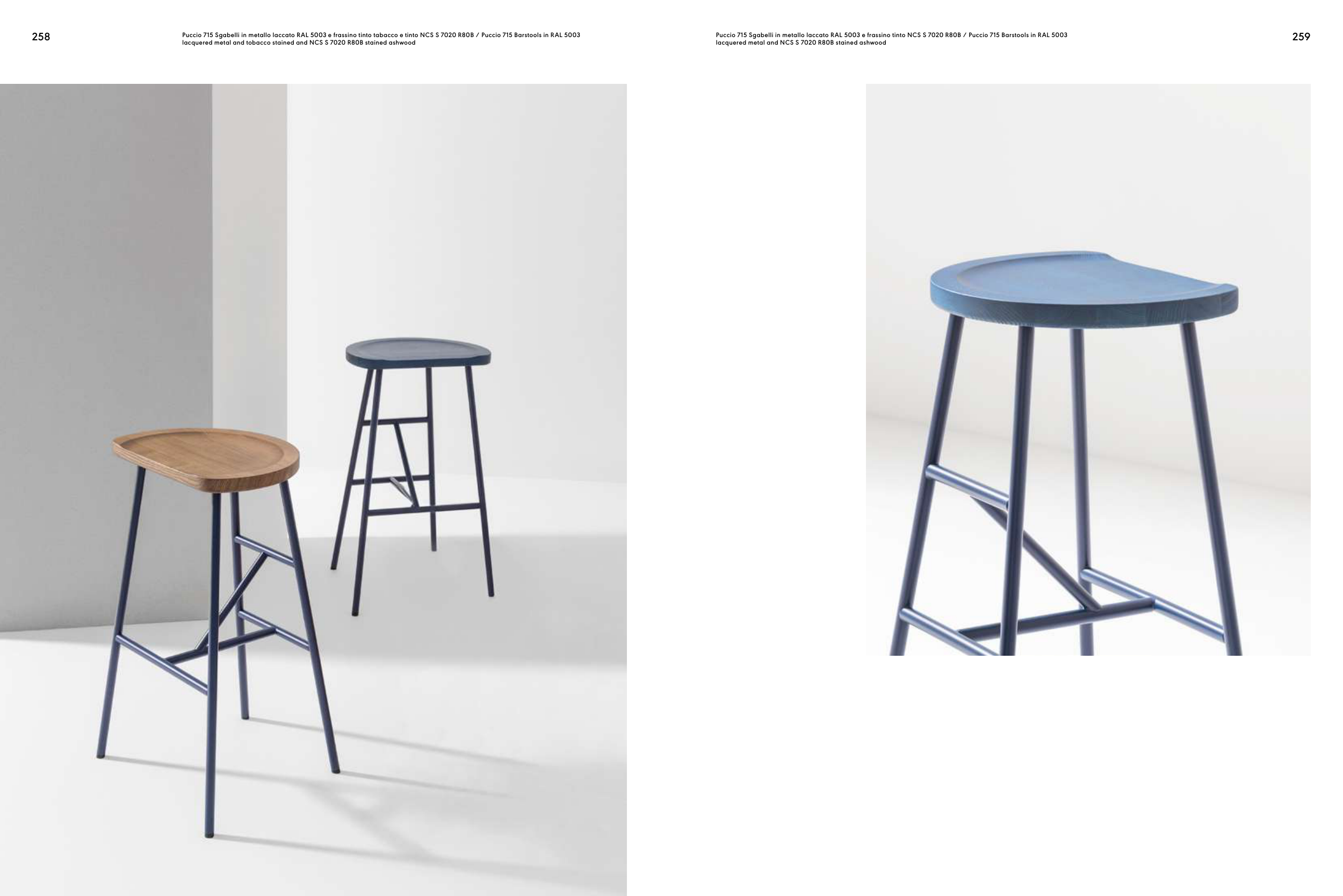 Puccio 715 Sgabelli in metallo laccato RAL 5003 e frassino tinto tabacco e tinto NCS S 7020 R80B / Puccio 715 Barstools in RAL 5003