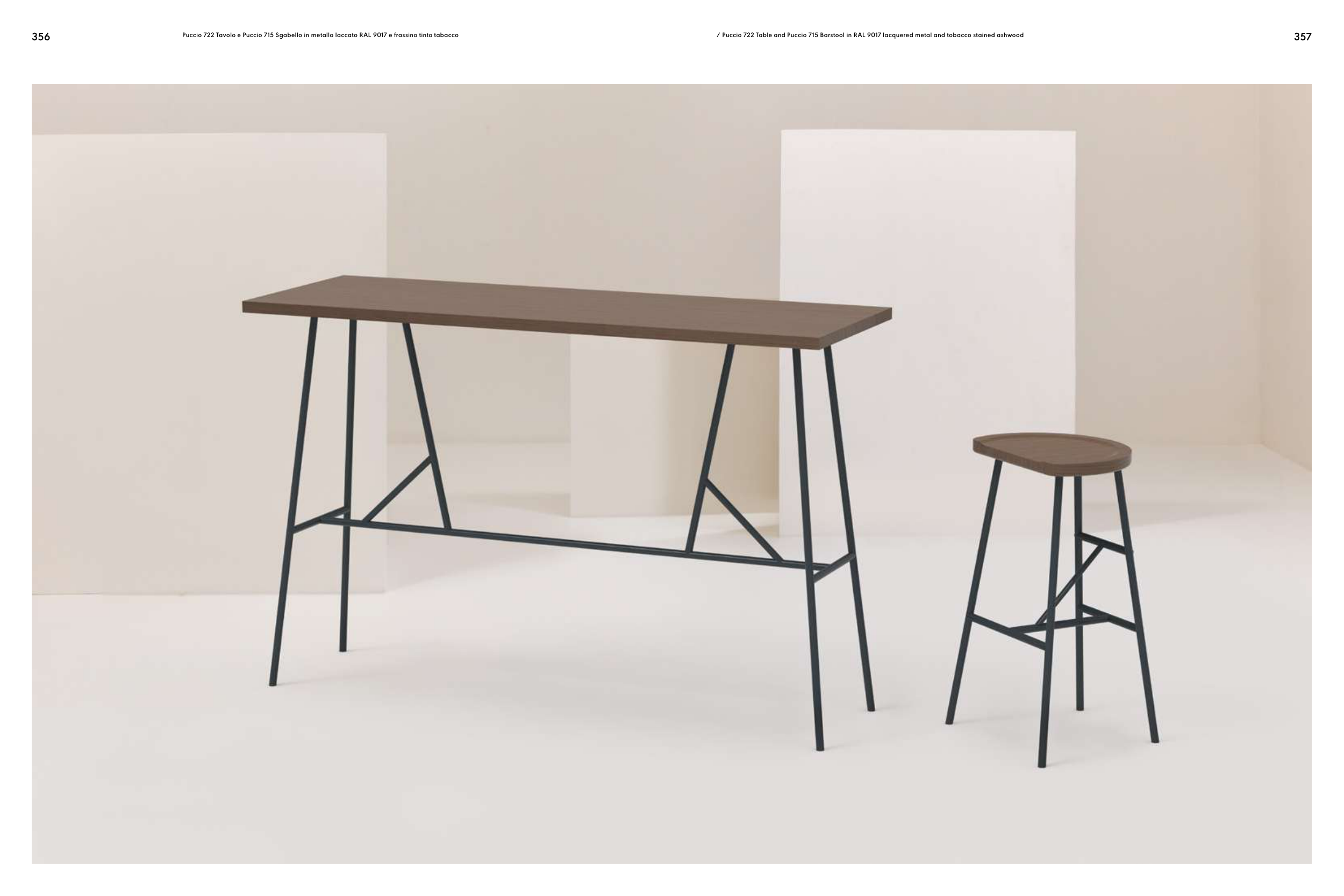 357 356 Puccio 722 Tavolo e Puccio 715 Sgabello in metallo laccato RAL 9017 e frassino tinto tabacco / Puccio 722 Table and Puccio 715 Barstool in RAL 9017 lacquered metal and tobacco stained ashwood