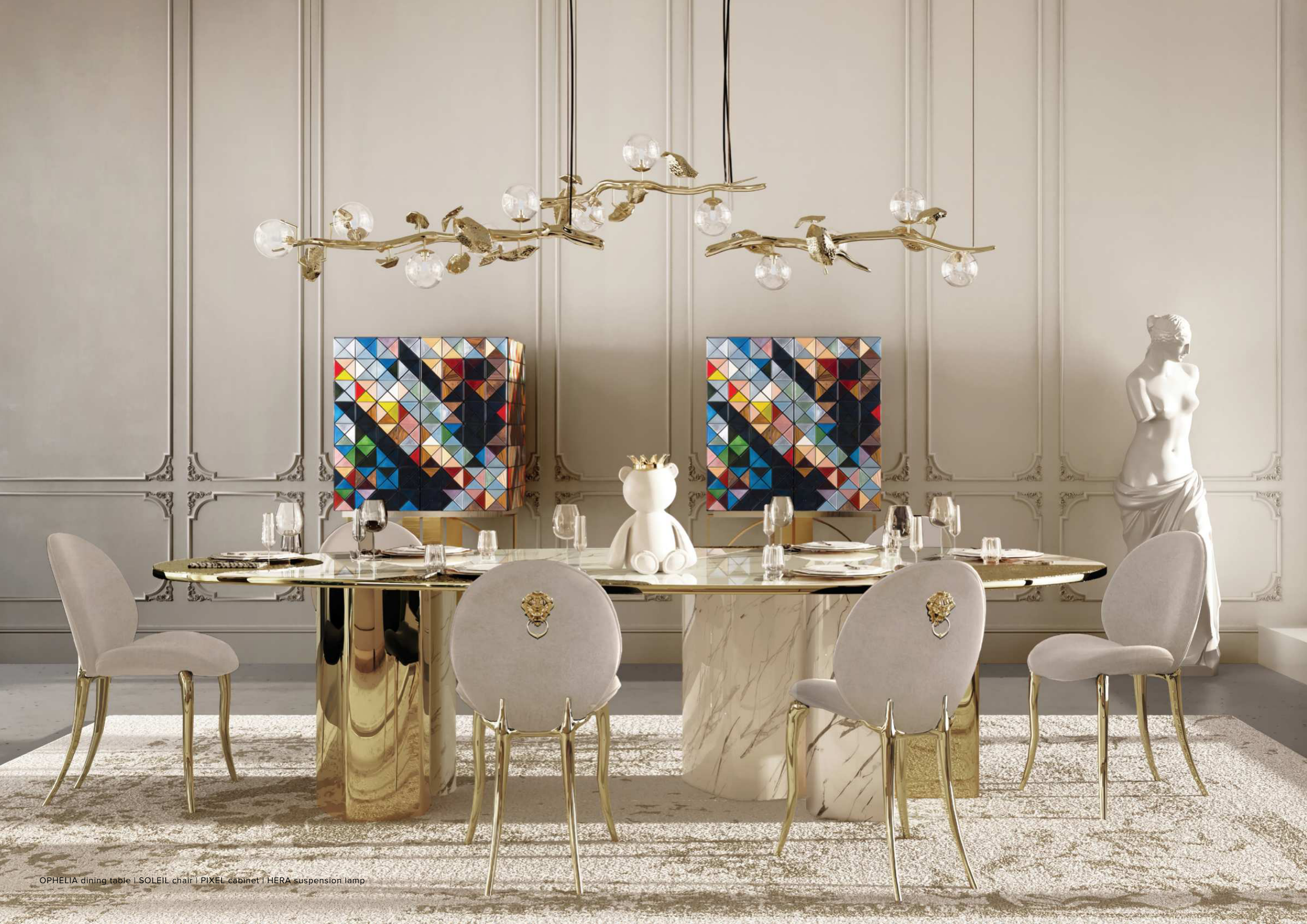OPHELIA dining table | SOLEIL chair | PIXEL cabinet | HERA suspension lamp