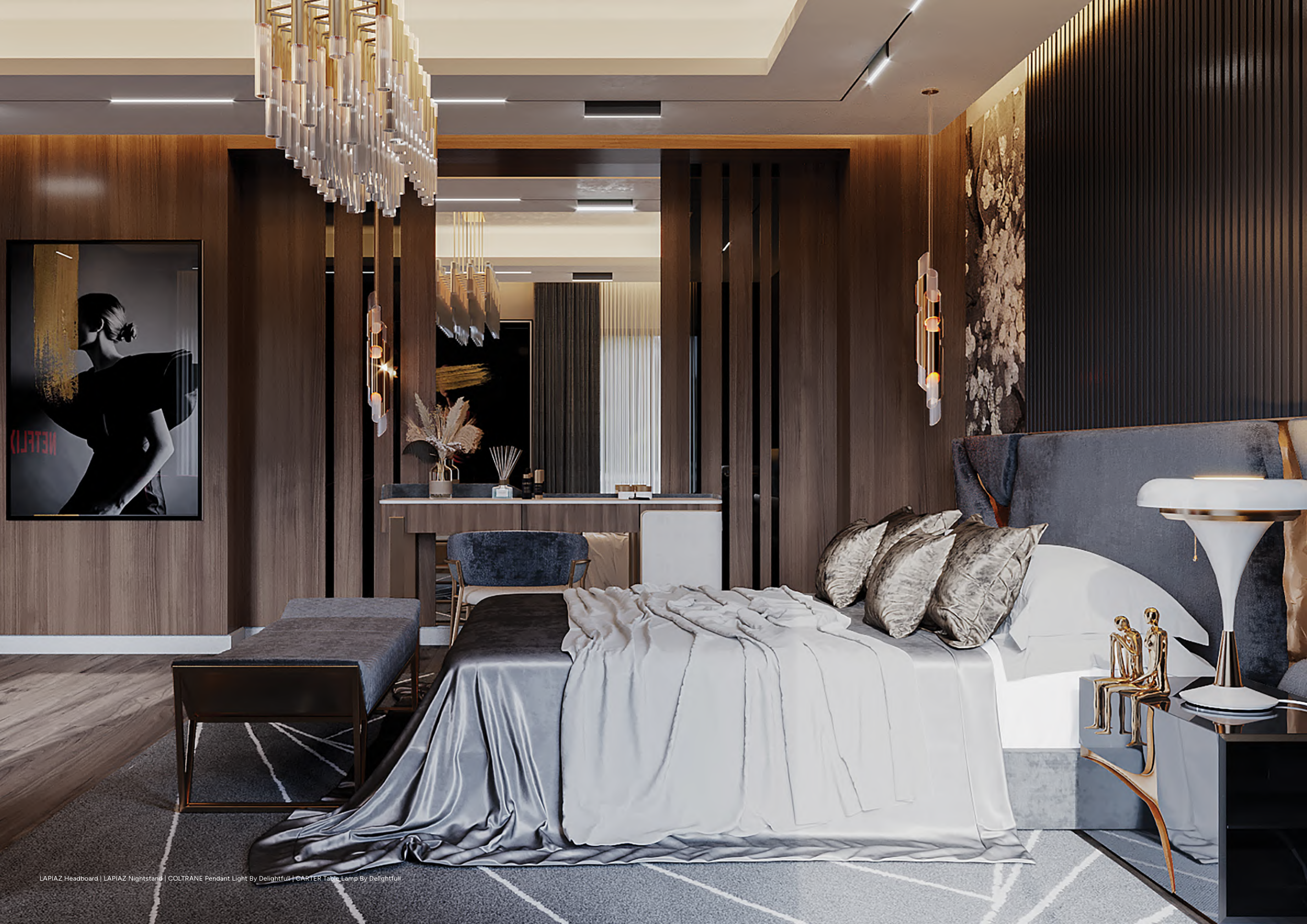 LAPIAZ Headboard | LAPIAZ Nightstand | COLTRANE Pendant Light By Delightfull | CARTER Table Lamp By Delightfull
