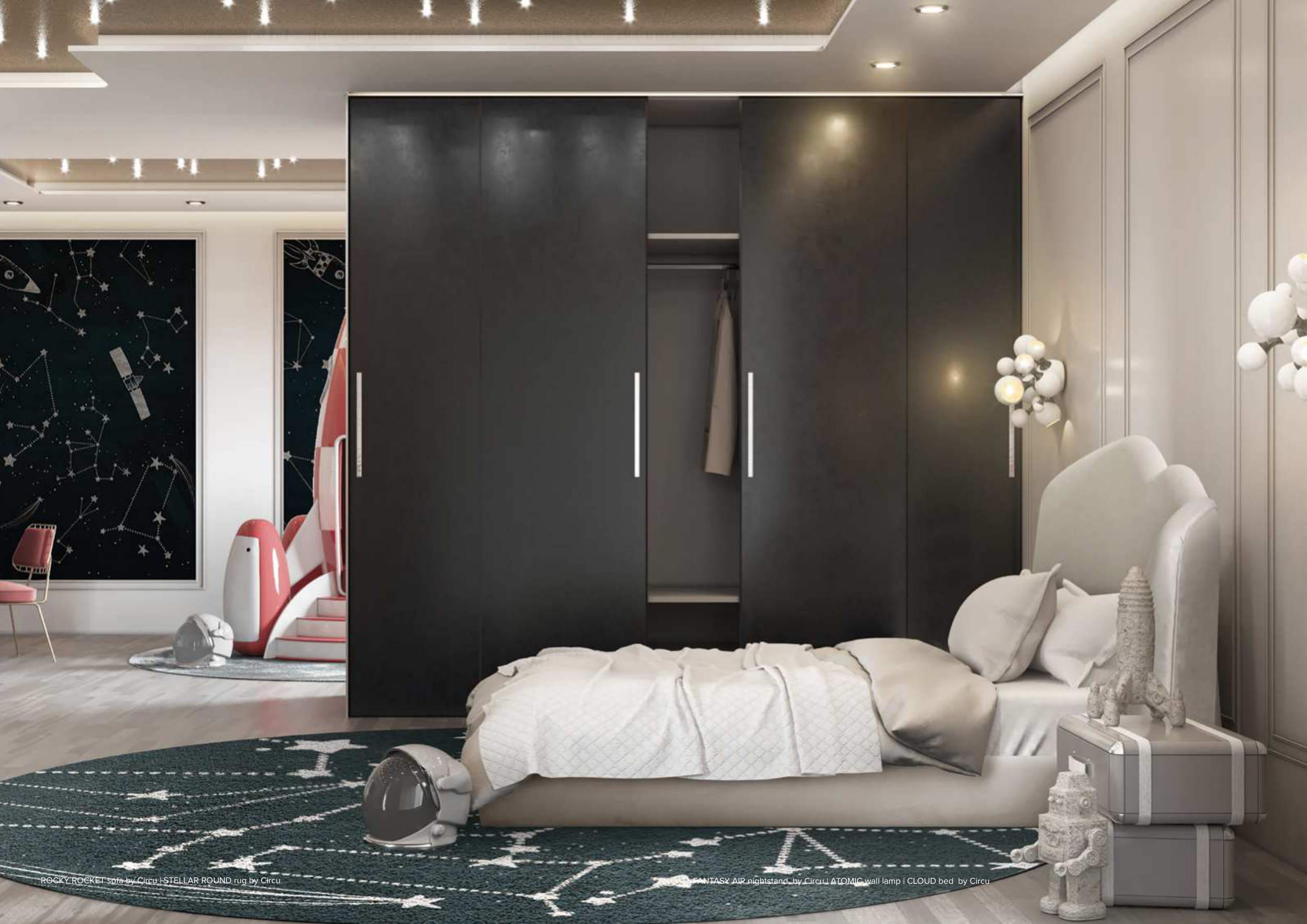 FANTASY AIR nightstand by Circu | ATOMIC wall lamp | CLOUD bed by Circu