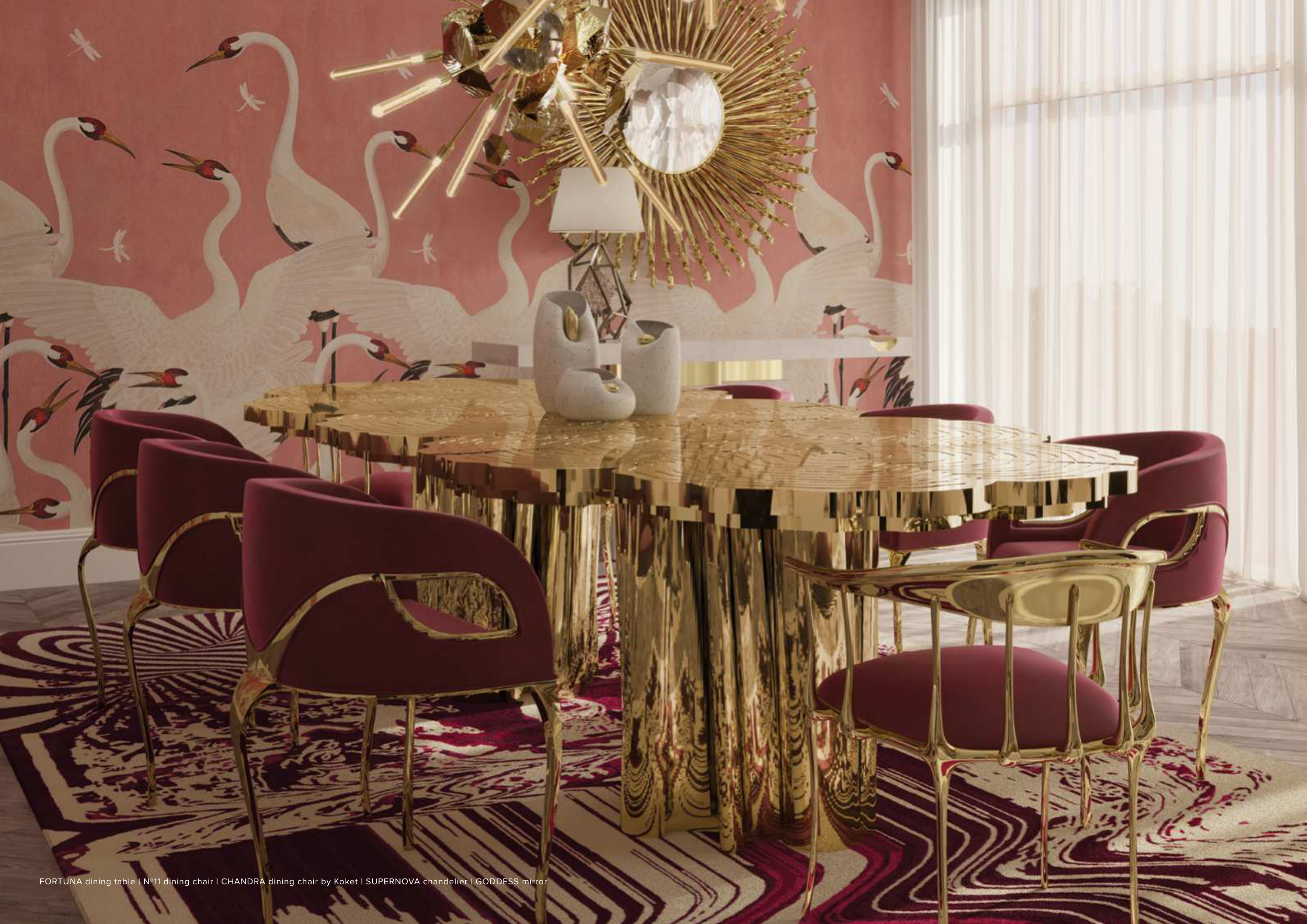 FORTUNA dining table | Nº11 dining chair | CHANDRA dining chair by Koket | SUPERNOVA chandelier | GODDESS mirror