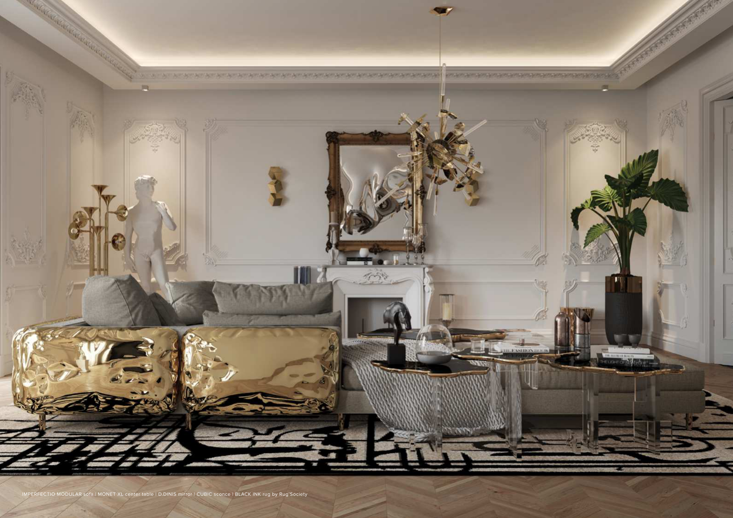 IMPERFECTIO MODULAR sofa | MONET XL center table | D.DINIS mirror | CUBIC sconce | BLACK INK rug by Rug’Society