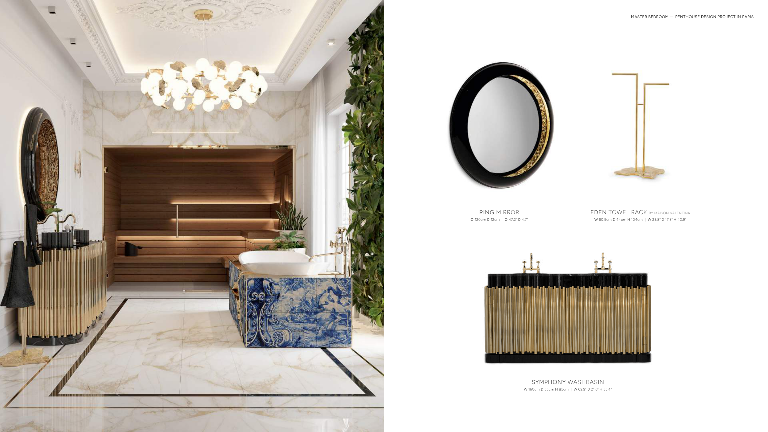 73 72 MASTER BEDROOM - PENTHOUSE DESIGN PROJECT IN PARIS RING MIRROR Ø 120cm D 12cm | Ø 47.2” D 4.7” EDEN TOWEL RACK BY MAISON VALENTINA W 60.5cm D 44cm H 104cm | W 23.8” D 17.3” H 40.9” SYMPHONY WASHBASIN W 160cm D 55cm H 85cm | W 62.9” D 21.6” H 33.4”
