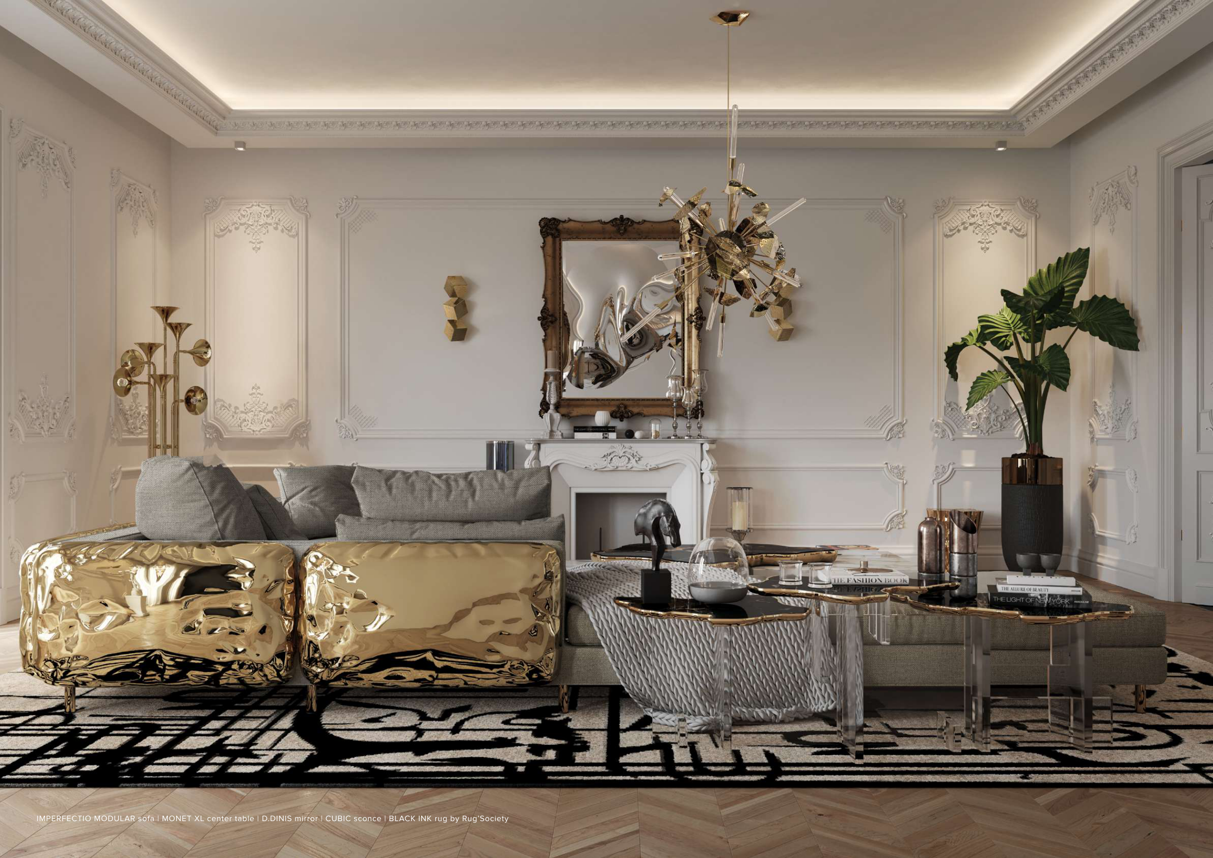 IMPERFECTIO MODULAR sofa | MONET XL center table | D.DINIS mirror | CUBIC sconce | BLACK INK rug by Rug’Society
