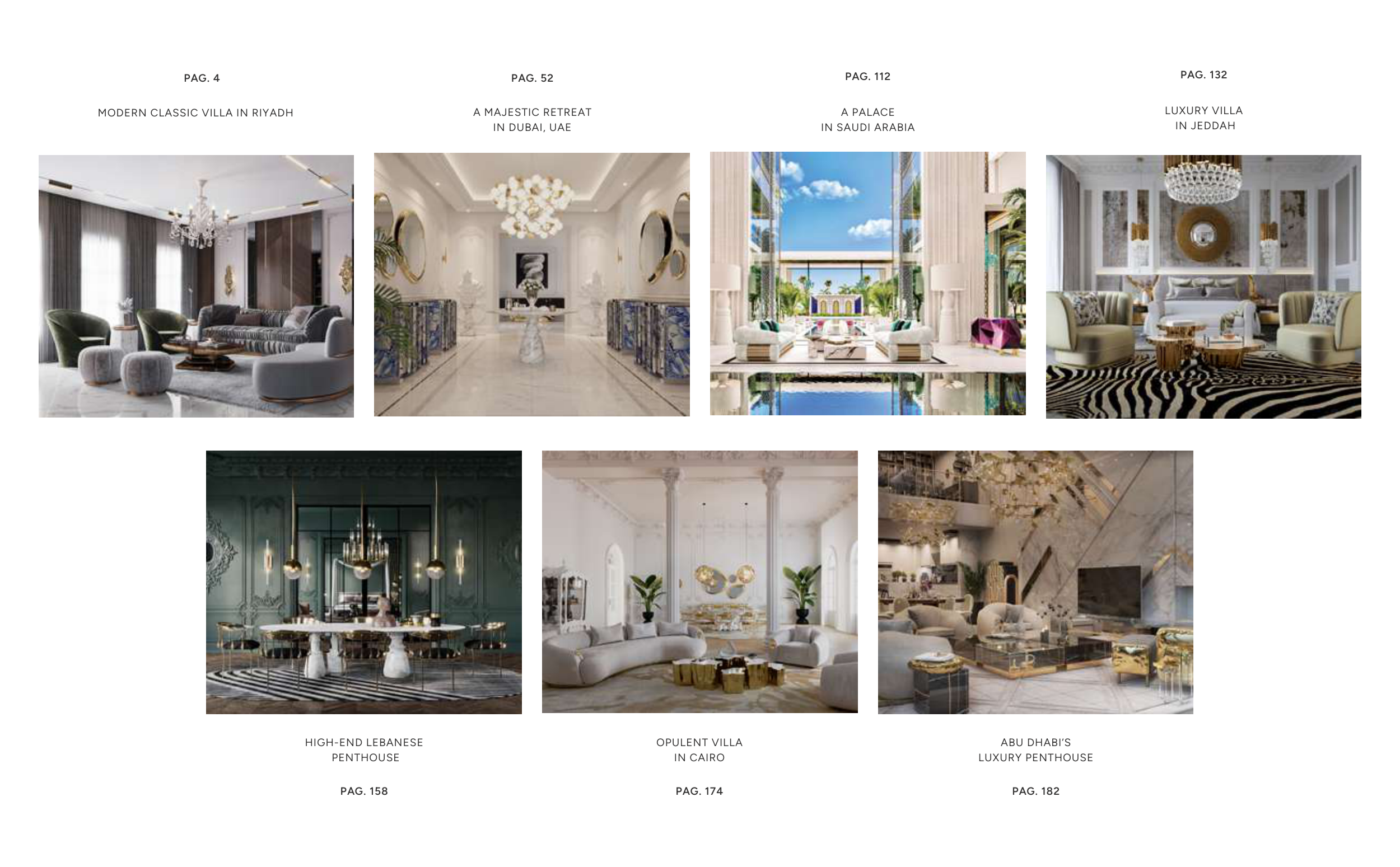 A MAJESTIC RETREAT IN DUBAI, UAE PAG. 52 PAG. 4 A PALACE IN SAUDI ARABIA PAG. 112 OPULENT VILLA IN CAIRO MODERN CLASSIC VILLA IN RIYADH PAG. 174 LUXURY VILLA IN JEDDAH PAG. 132 HIGH-END LEBANESE PENTHOUSE ABU DHABI’S LUXURY PENTHOUSE PAG. 158 PAG. 182