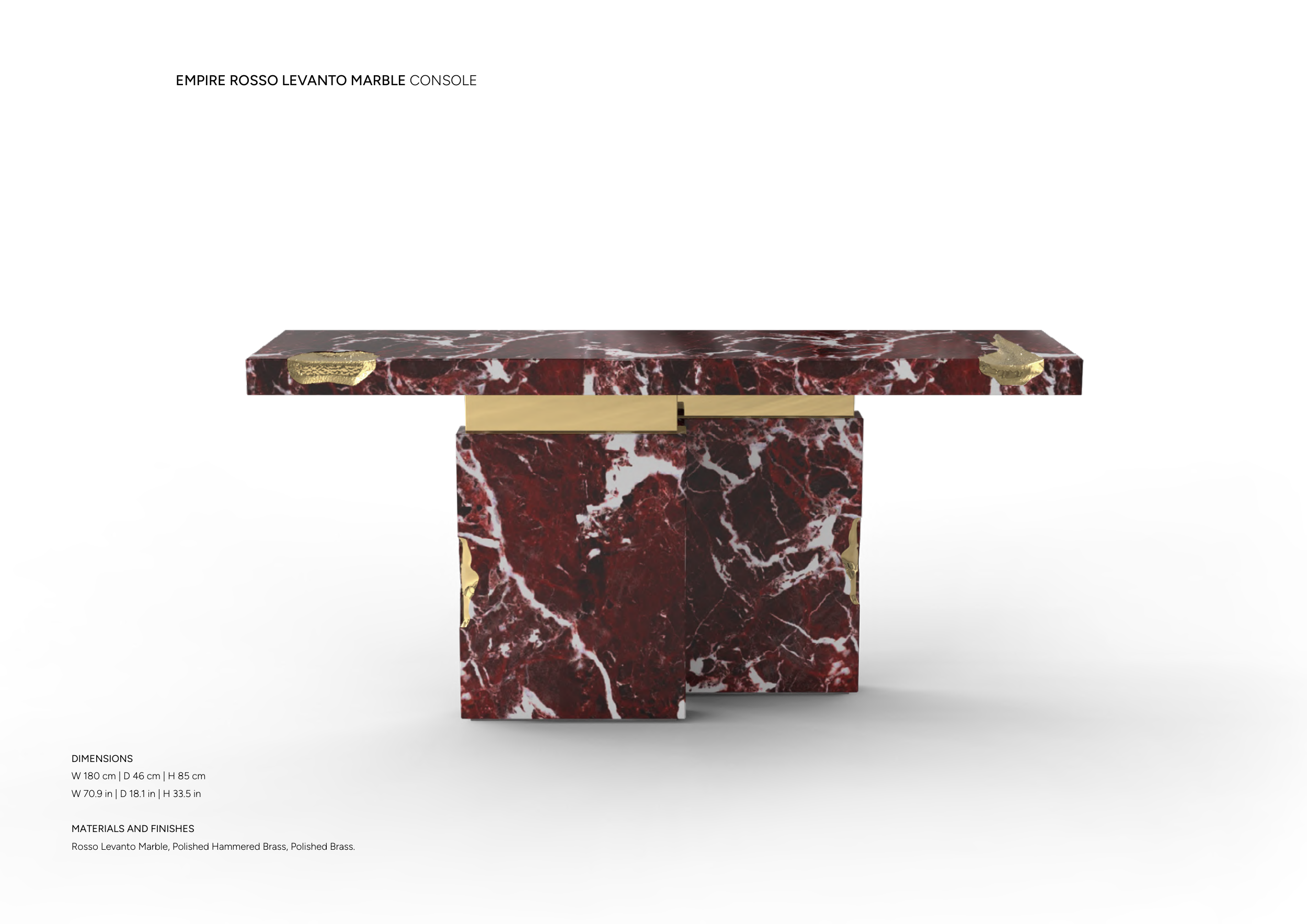 EMPIRE ROSSO LEVANTO MARBLE CONSOLE DIMENSIONS W 180 cm | D 46 cm | H 85 cm W 70.9 in | D 18.1 in | H 33.5 in MATERIALS AND FINISHES Rosso Levanto Marble, Polished Hammered Brass, Polished Brass.