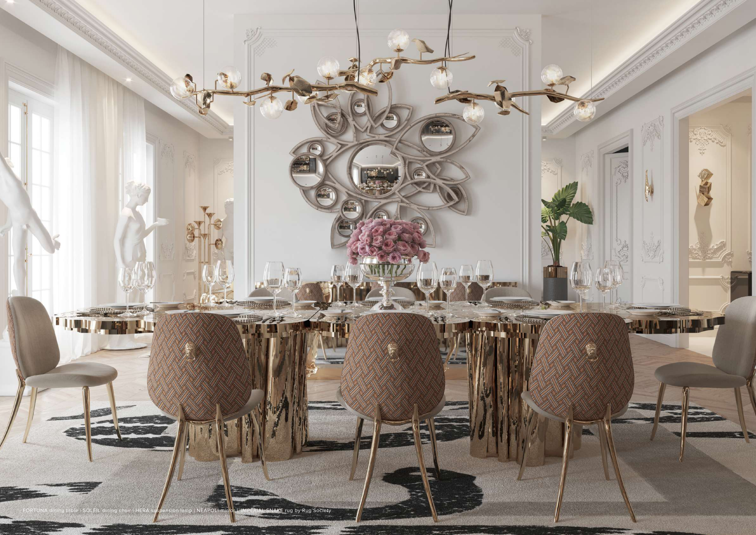 FORTUNA dining table | SOLEIL dining chair | HERA suspension lamp | NEAPOLI mirror | IMPERIAL SNAKE rug by Rug’Society