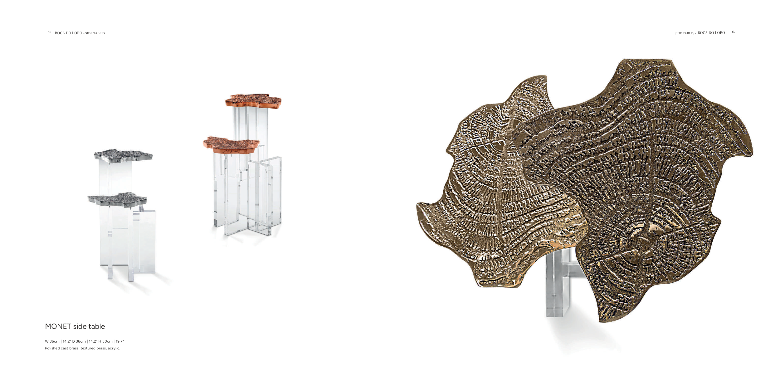 66 | BOCA DO LOBO 67 BOCA DO LOBO | MONET side table W 36cm | 14.2” D 36cm | 14.2” H 50cm | 19.7” Polished cast brass, textured brass, acrylic. - SIDE TABLES SIDE TABLES -