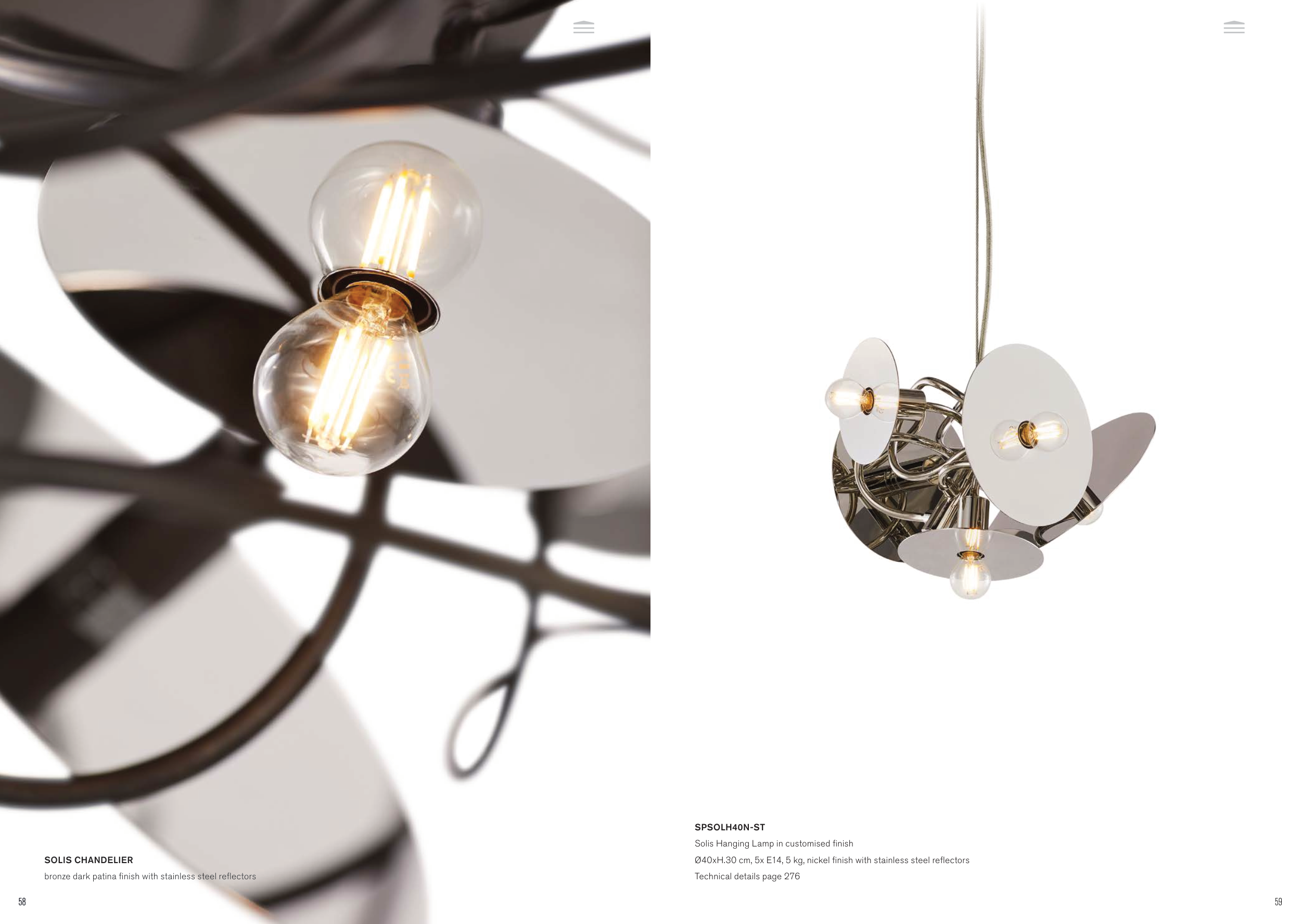 SPSOLH40N-ST Solis Hanging Lamp in customised finish Ø40xH.30 cm, 5x E14, 5 kg, nickel finish with stainless steel reflectors Technical details page 276 SOLIS CHANDELIER bronze dark patina finish with stainless steel reflectors 58 59