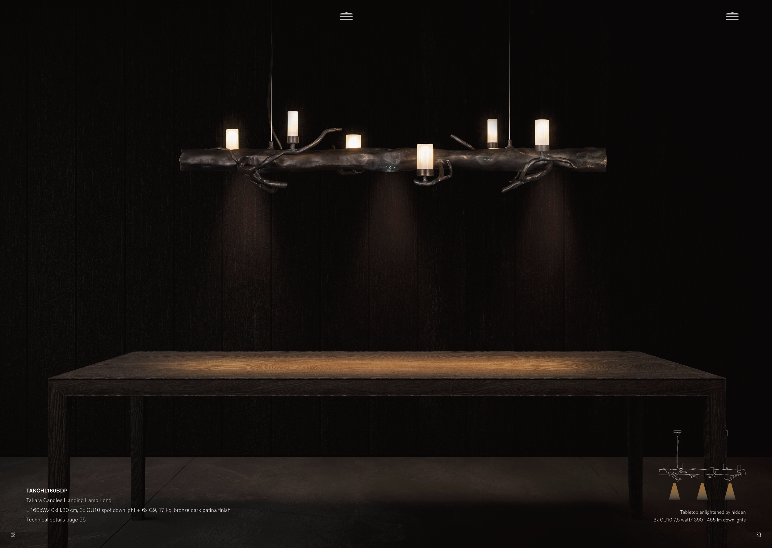 L.160xW.40xH.30 cm, 3x GU10 spot downlight + 6x G9, 17 kg, bronze dark patina finish