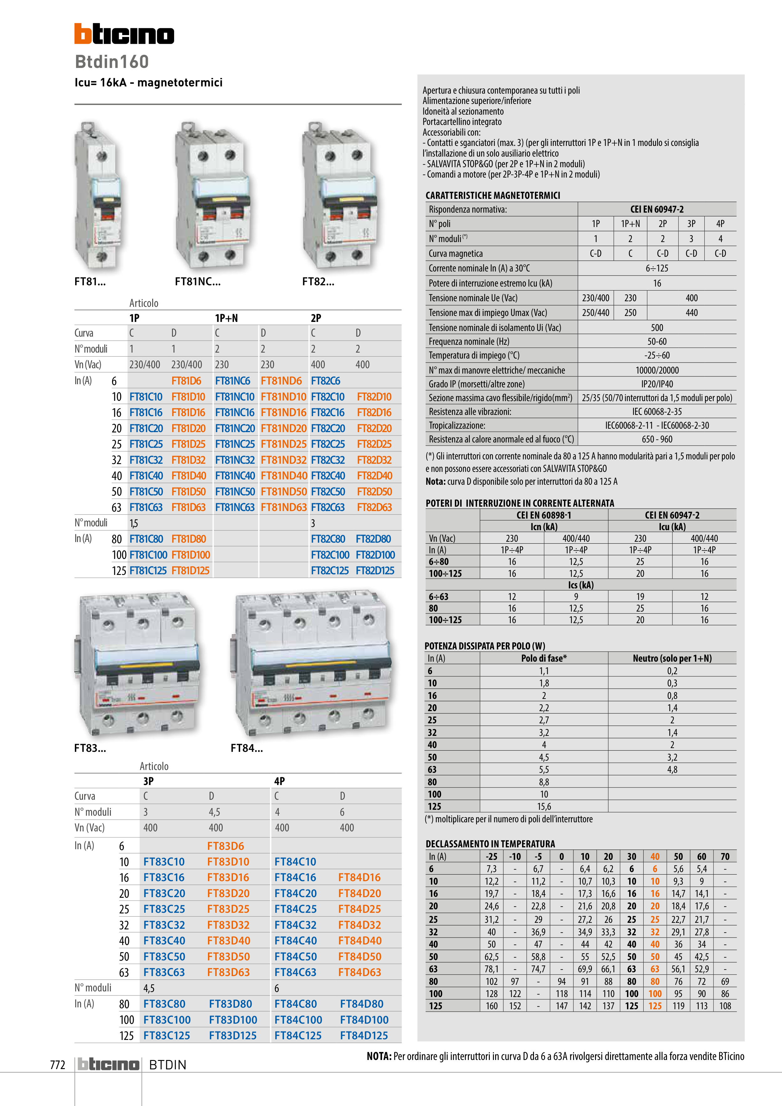 NOTA: Per ordinare gli interruttori in curva D da 6 a 63A rivolgersi direttamente alla forza vendite BTicino