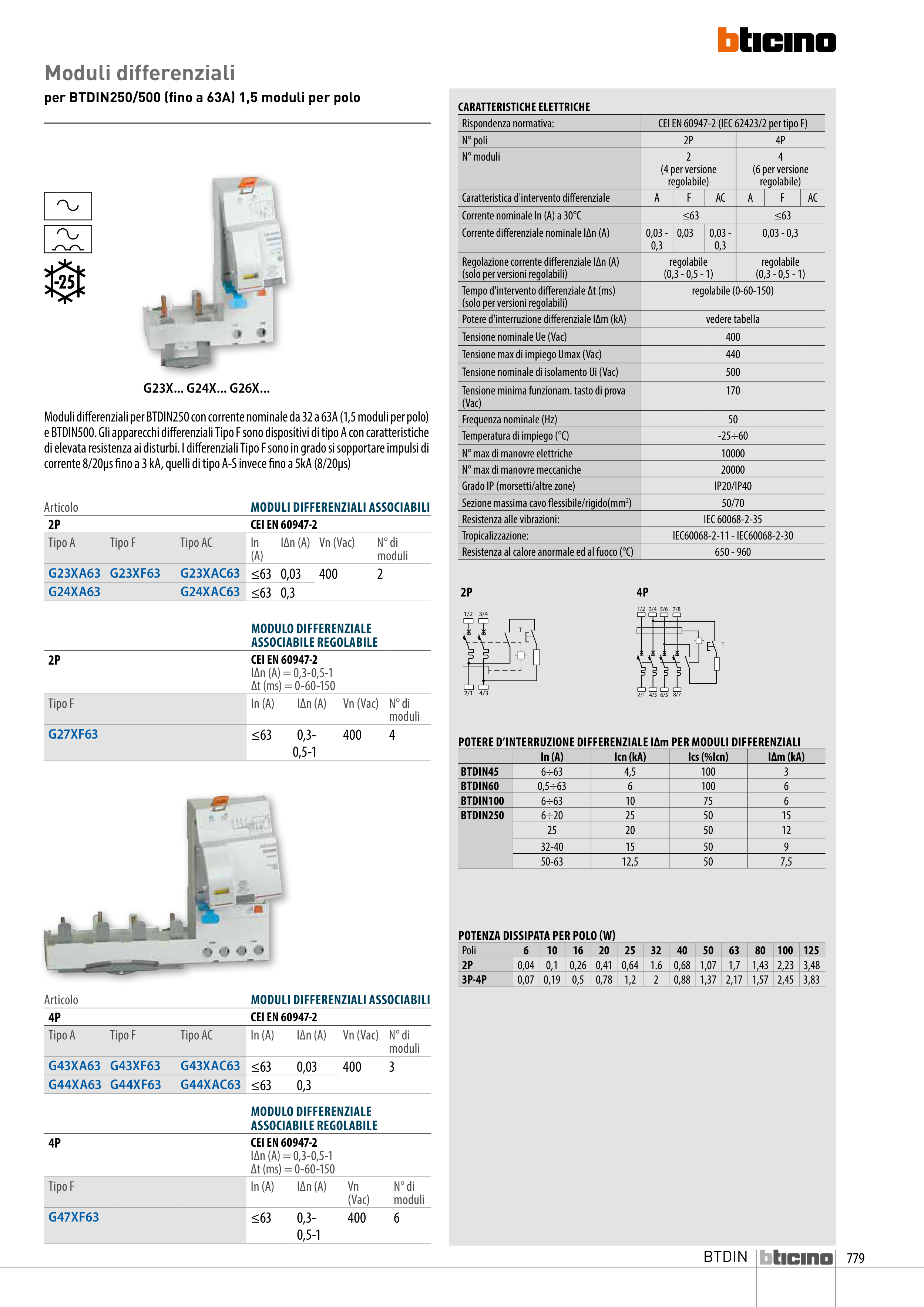 per BTDIN250/500 (fino a 63A) 1,5 moduli per polo