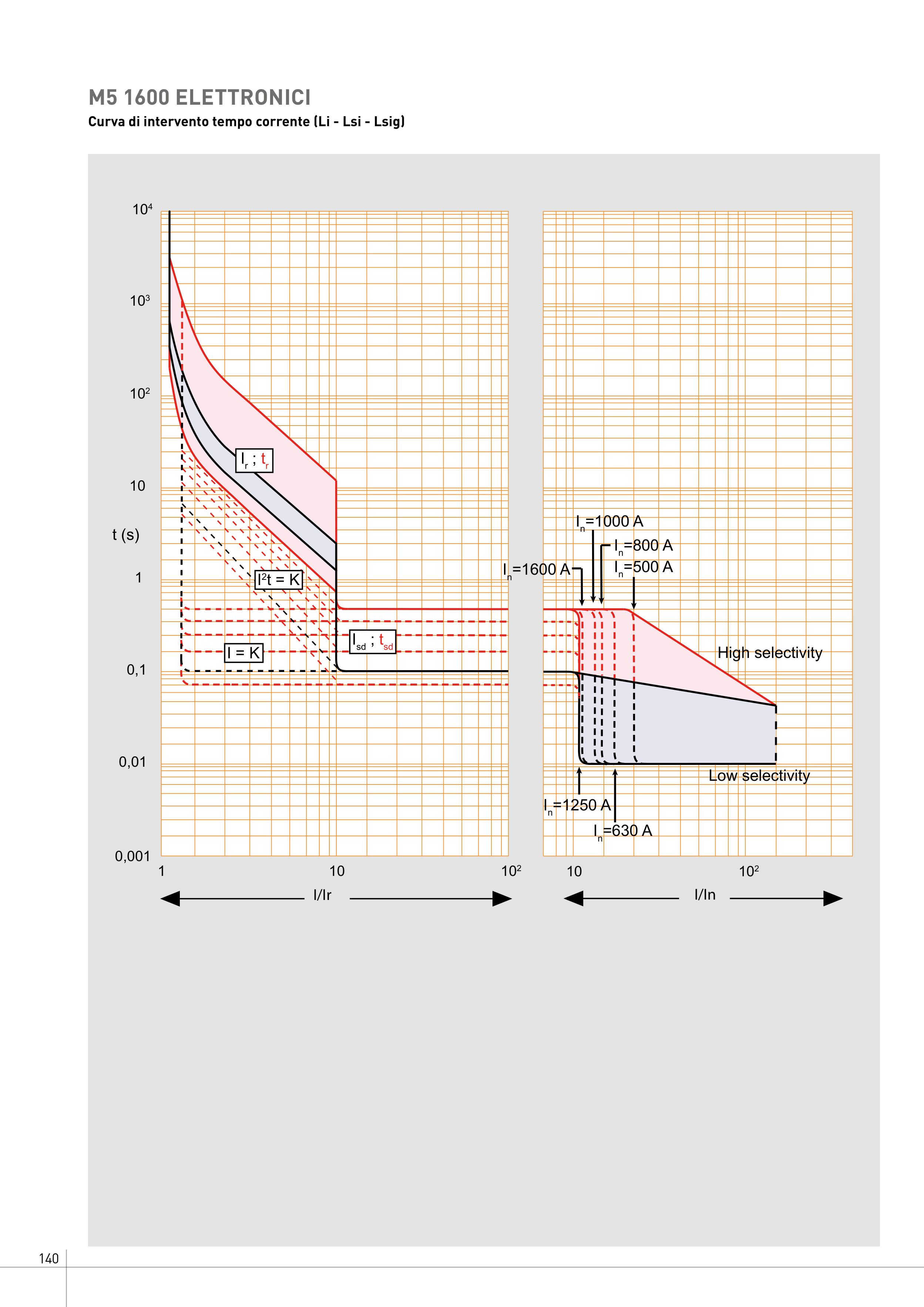 140 M5 1600 ELETTRONICI Curva di intervento tempo corrente (Li - Lsi - Lsig) I/Ir I/In 10 102 1 10 102 0,001 0,01 0,1 1 10 102 103 104 t (s) Isd ; tsd I = K I2t = K High selectivity Low selectivity In=630 A In=500 A In=1250 A In=800 A In=1000 A In=1600 A Ir ; tr