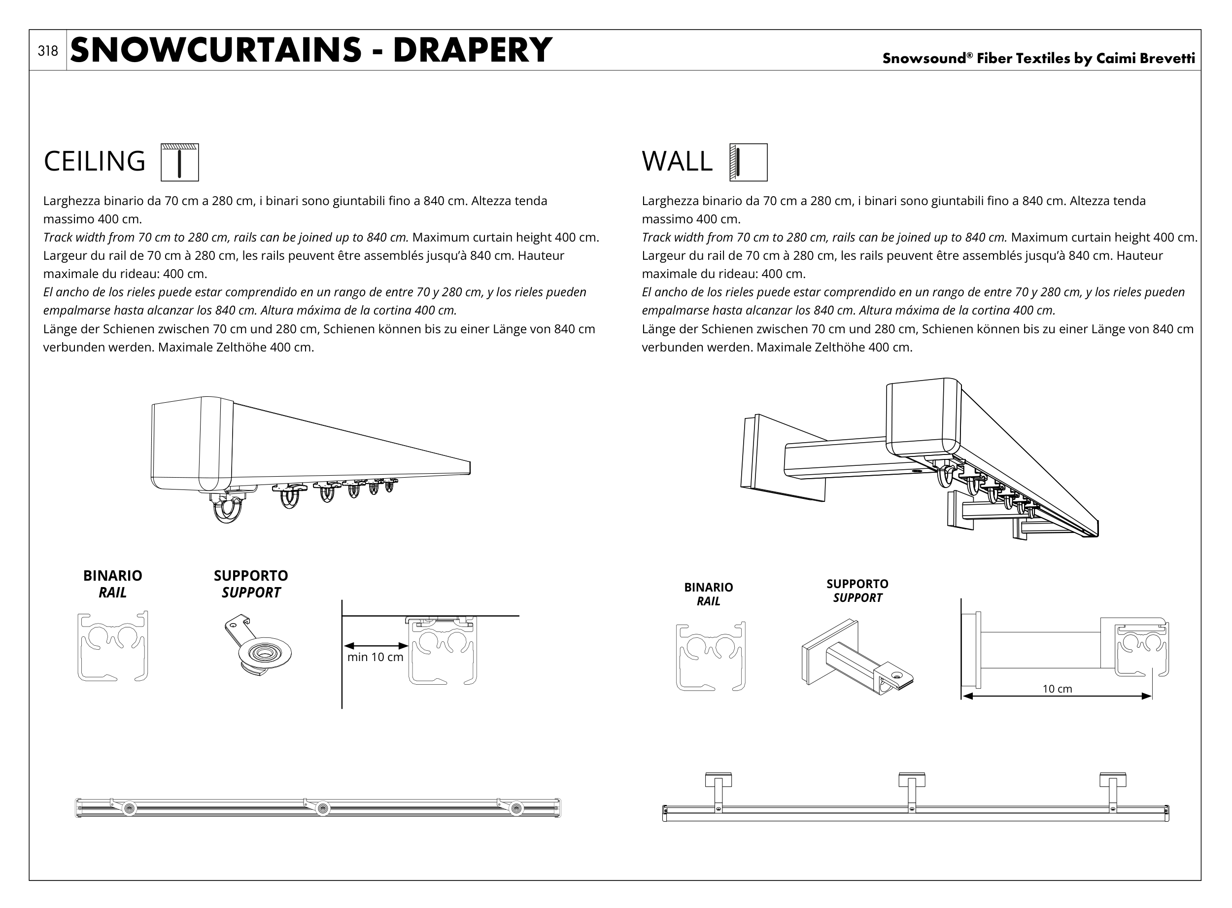 Track width from 70 cm to 280 cm, rails can be joined up to 840 cm. Maximum curtain height 400 cm.