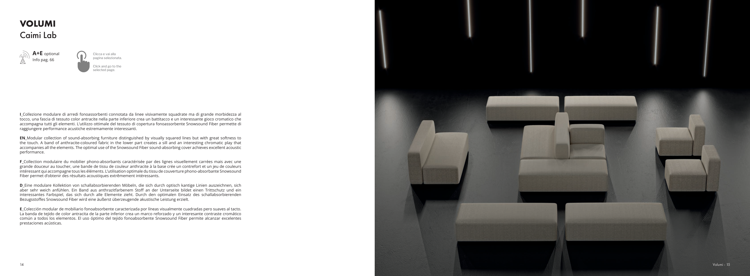 I_Collezione modulare di arredi fonoassorbenti connotata da linee visivamente squadrate ma di grande morbidezza al