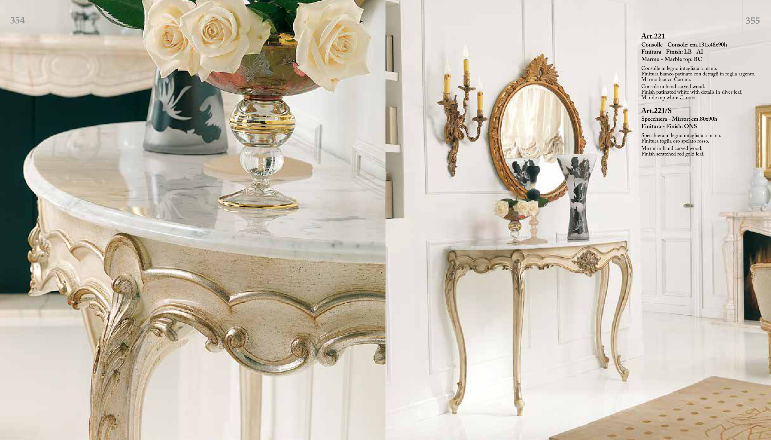Finitura bianco patinato con dettagli in foglia argento.