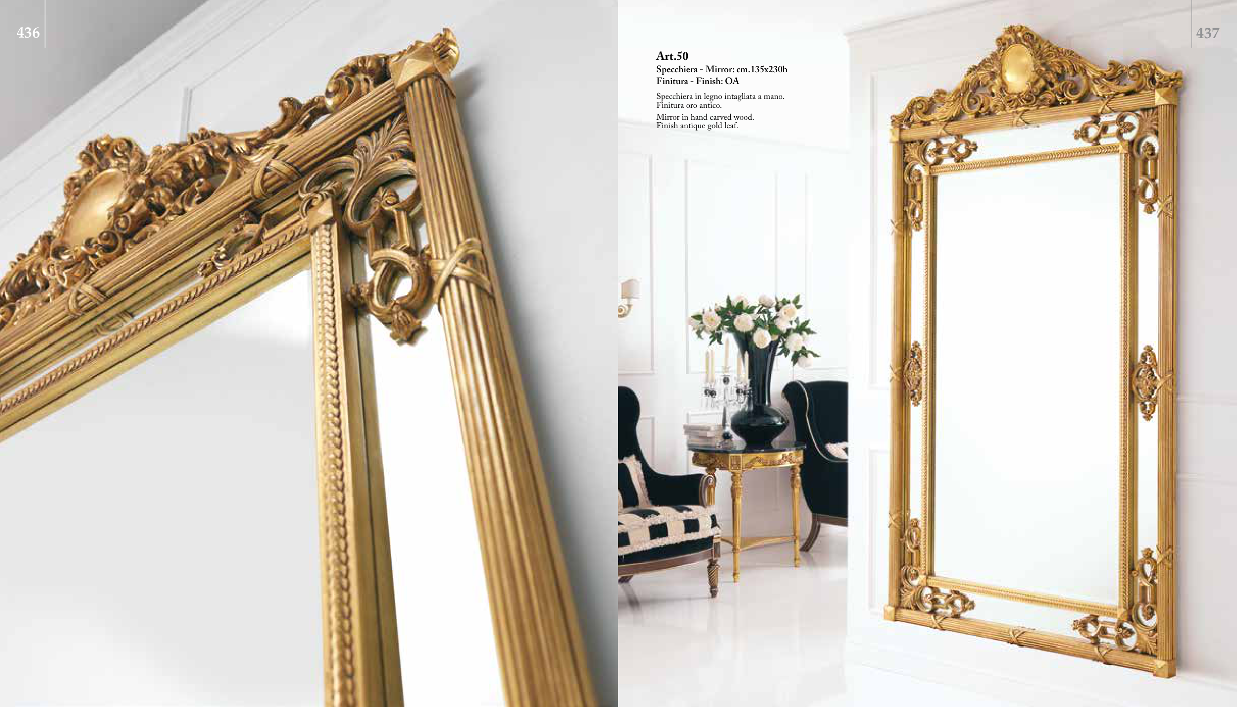 Art.50 Specchiera - Mirror: cm.135x230h Finitura - Finish: OA Specchiera in legno intagliata a mano. Finitura oro antico. Mirror in hand carved wood. Finish antique gold leaf. 437 436