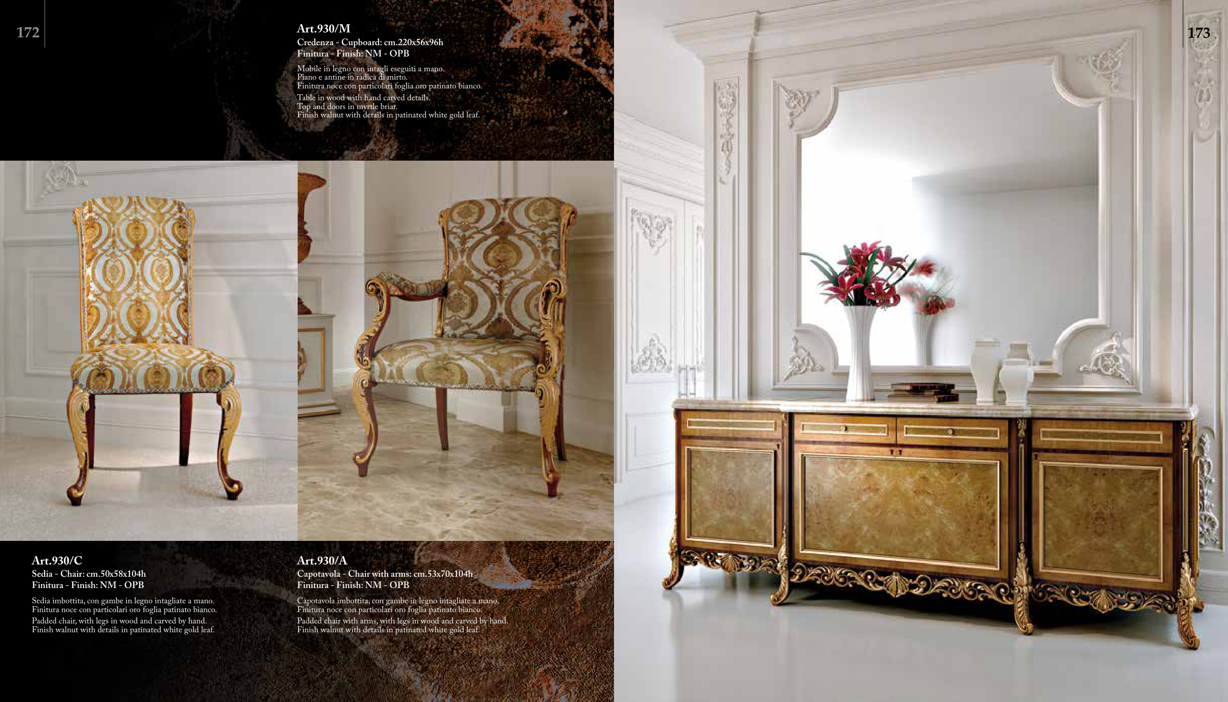 Finitura noce con particolari foglia oro patinato bianco.