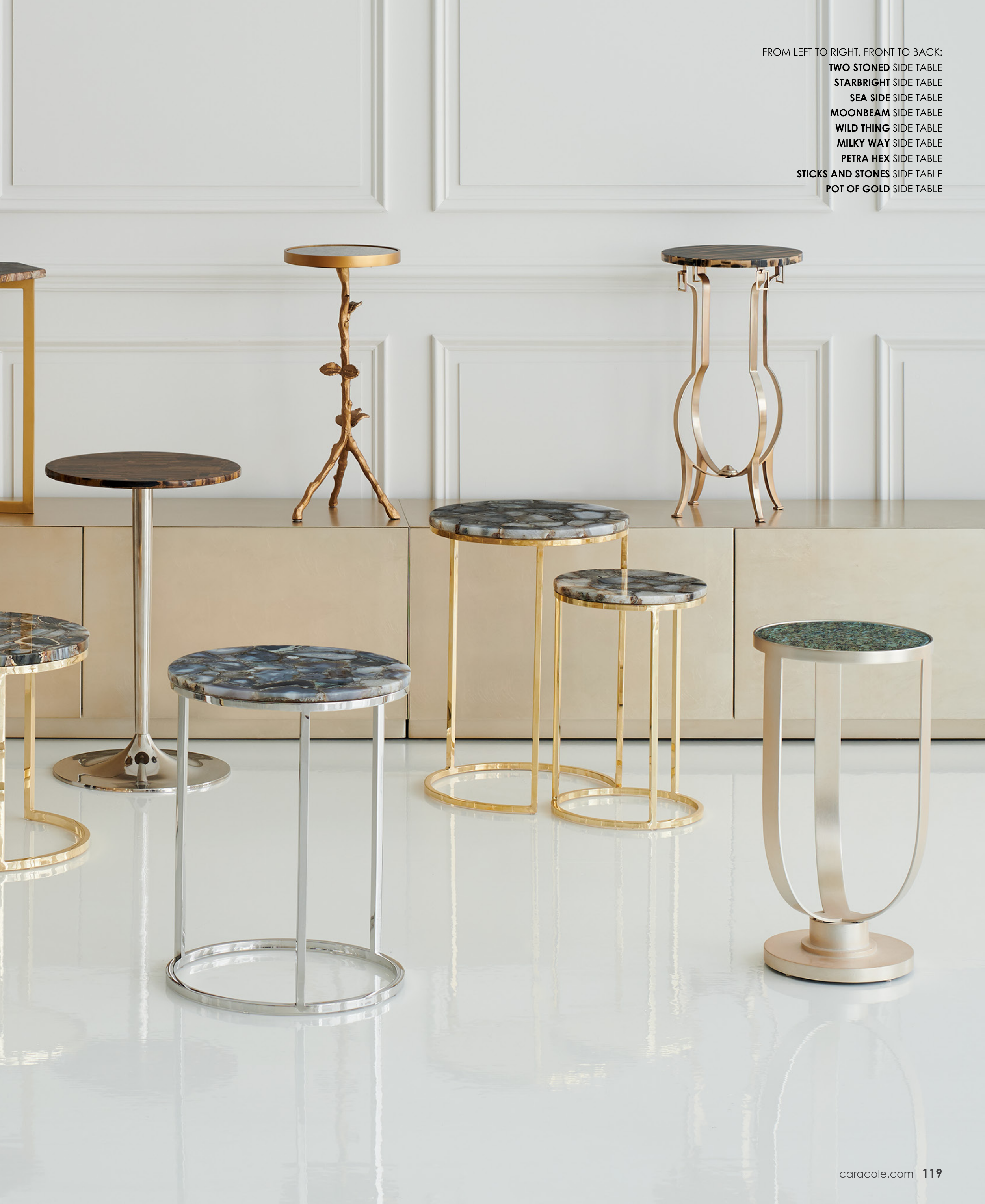 FROM LEFT TO RIGHT, FRONT TO BACK: TWO STONED SIDE TABLE STARBRIGHT SIDE TABLE SEA SIDE SIDE TABLE MOONBEAM SIDE TABLE WILD THING SIDE TABLE MILKY WAY SIDE TABLE PETRA HEX SIDE TABLE STICKS AND STONES SIDE TABLE POT OF GOLD SIDE TABLE caracole.com 119