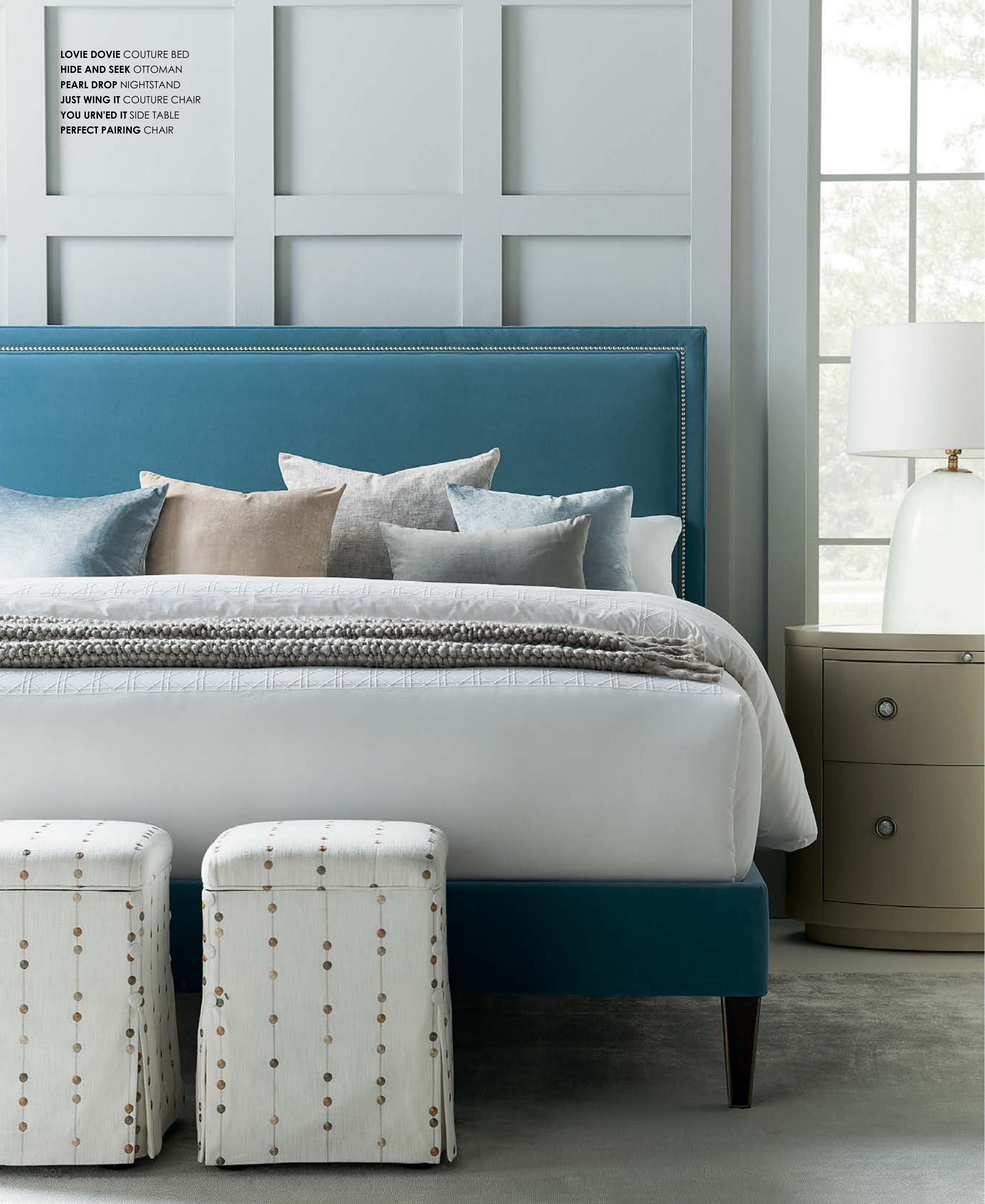 LOVIE DOVIE COUTURE BED HIDE AND SEEK OTTOMAN PEARL DROP NIGHTSTAND JUST WING IT COUTURE CHAIR YOU URN'ED IT SIDE TABLE PERFECT PAIRING CHAIR 306 caracole.com