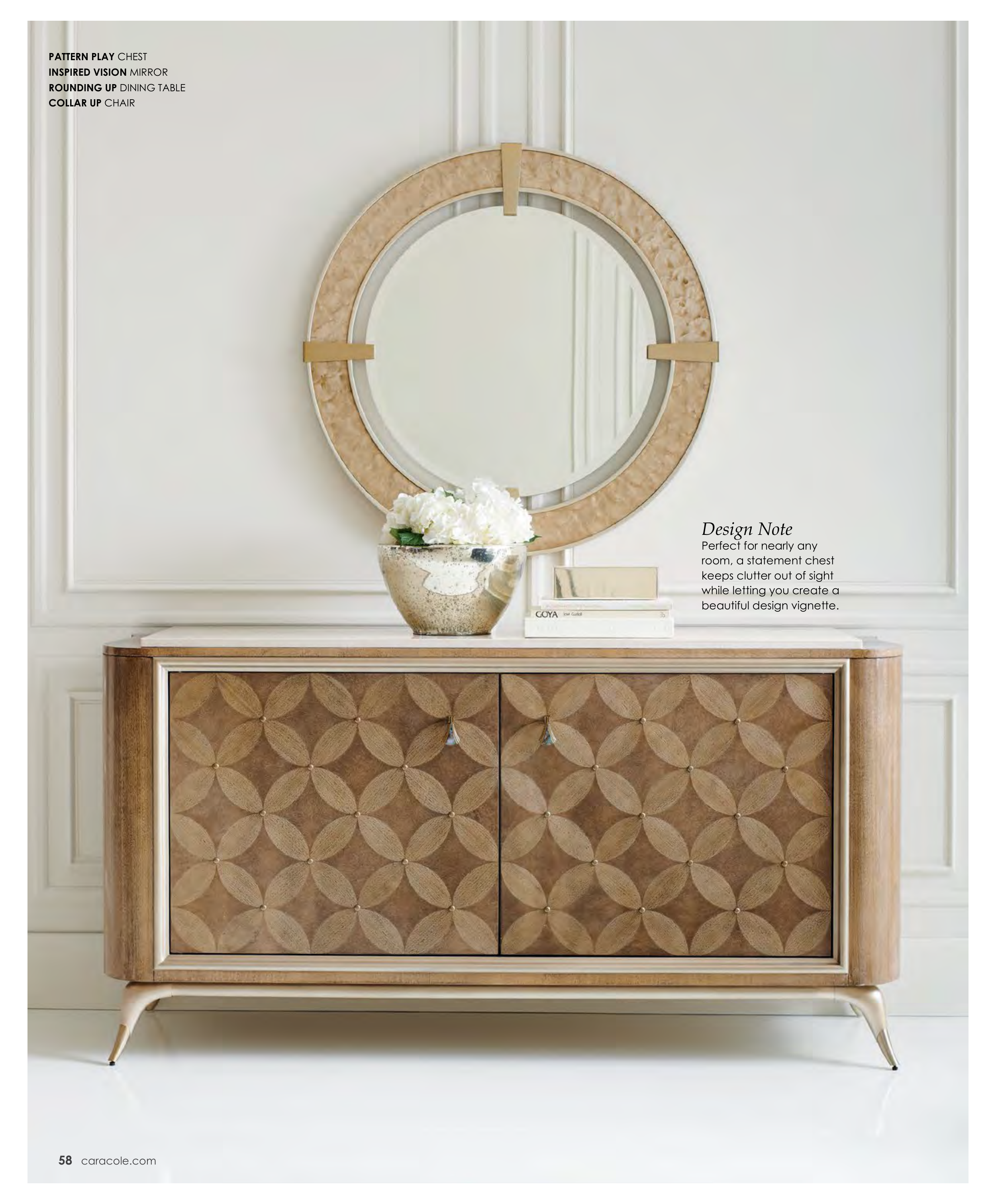 58 caracole.com Design Note Perfect for nearly any room, a statement chest keeps clutter out of sight while letting you create a beautiful design vignette. PATTERN PLAY CHEST INSPIRED VISION MIRROR ROUNDING UP DINING TABLE COLLAR UP CHAIR