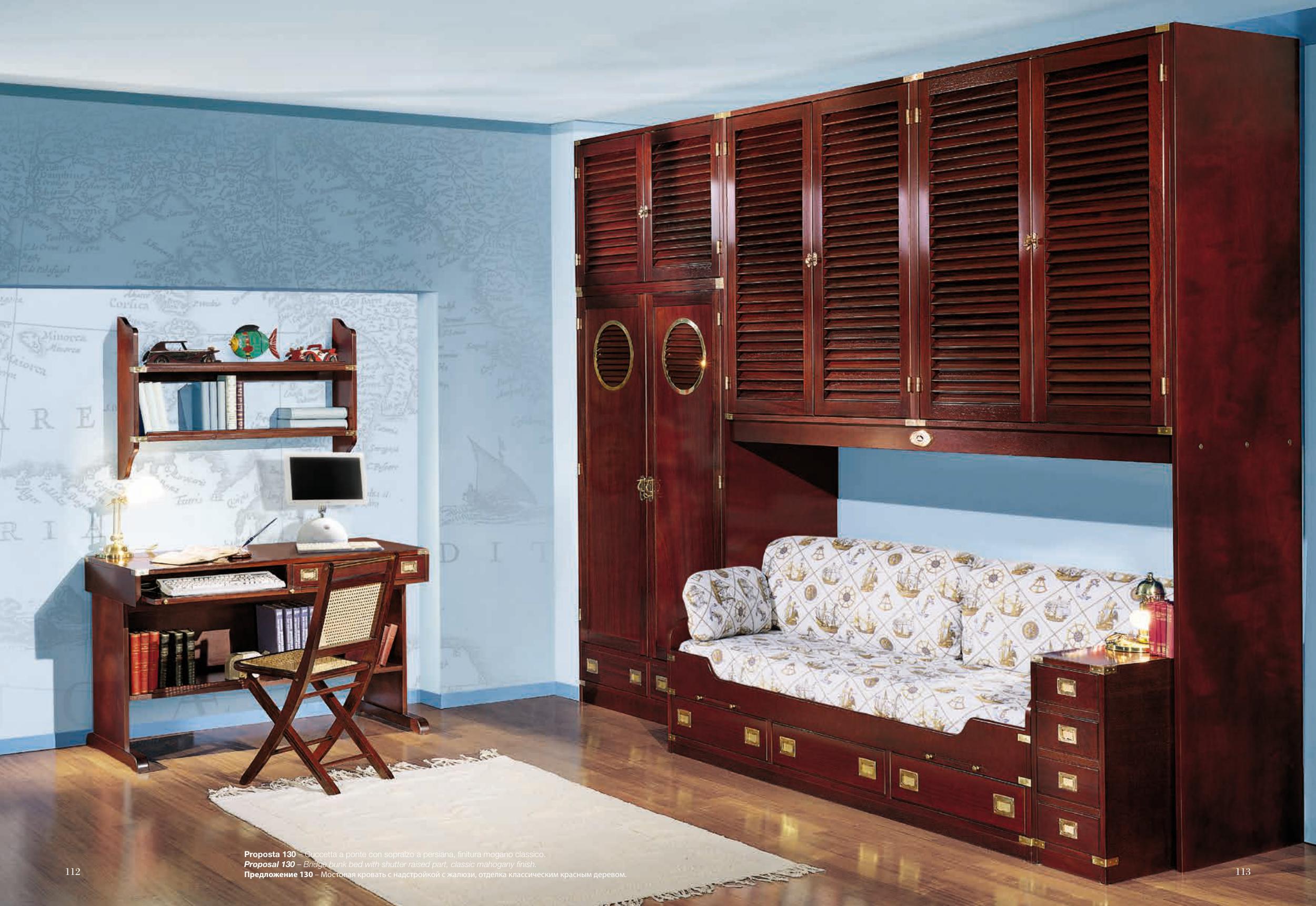 Proposal 130 – Bridge bunk bed with shutter raised part, classic mahogany finish.