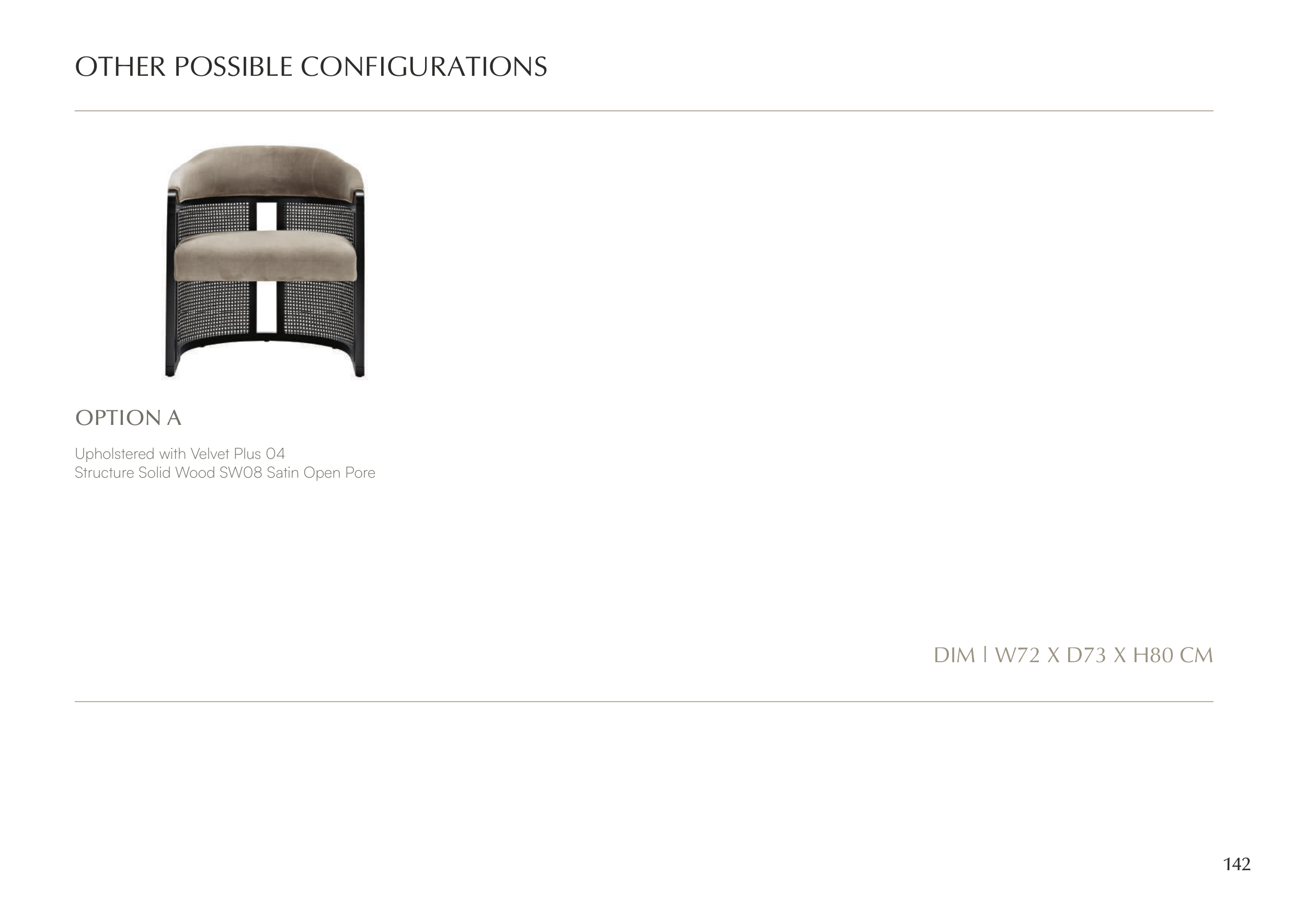 142 DIM | W72 X D73 X H80 CM Upholstered with Velvet Plus 04 Structure Solid Wood SW08 Satin Open Pore OPTION A OTHER POSSIBLE CONFIGURATIONS Upholstered with Velvet Plus 04 OPTION A