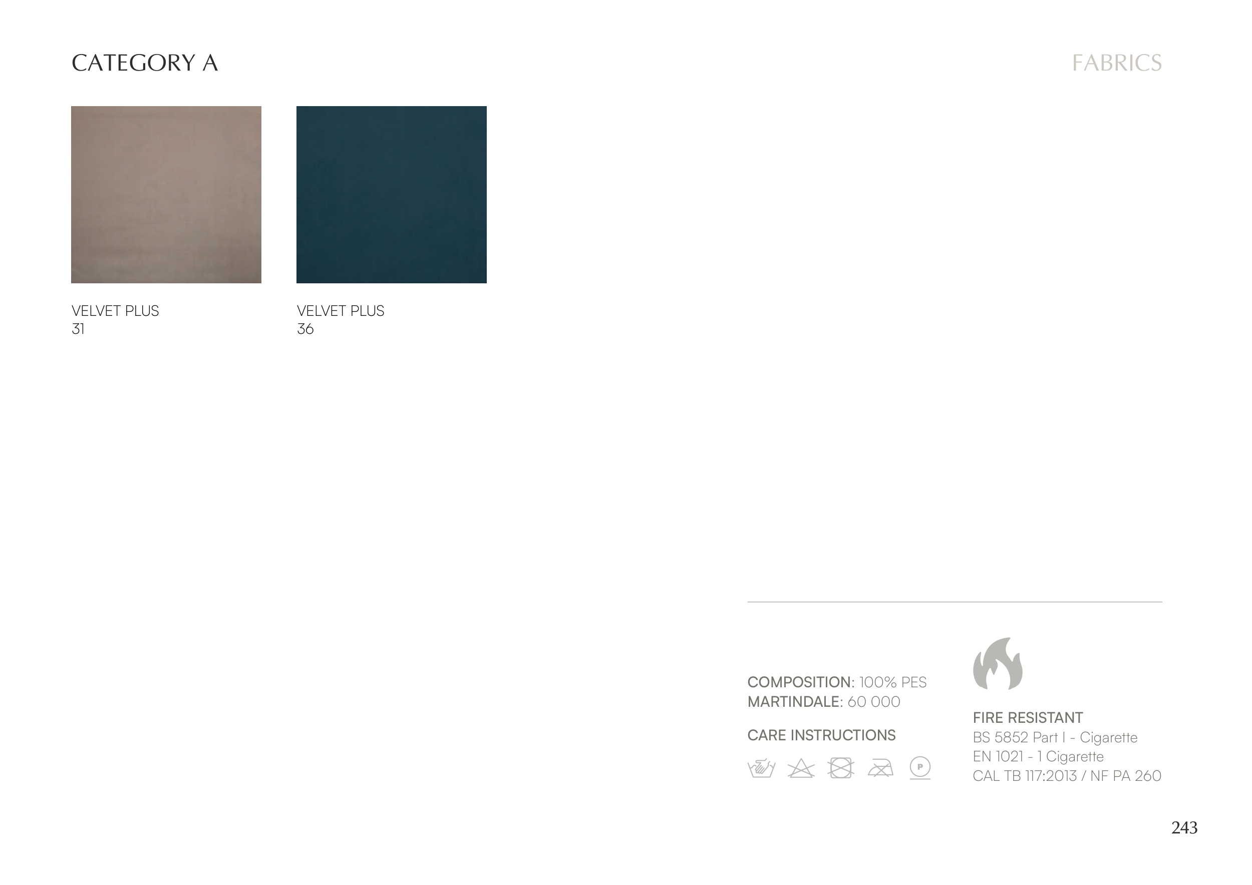 243 COMPOSITION: 100% PES MARTINDALE: 60 000 FIRE RESISTANT BS 5852 Part I - Cigarette EN 1021 - 1 Cigarette CAL TB 117:2013 / NF PA 260 CARE INSTRUCTIONS CATEGORY A FABRICS VELVET PLUS 31 VELVET PLUS 36