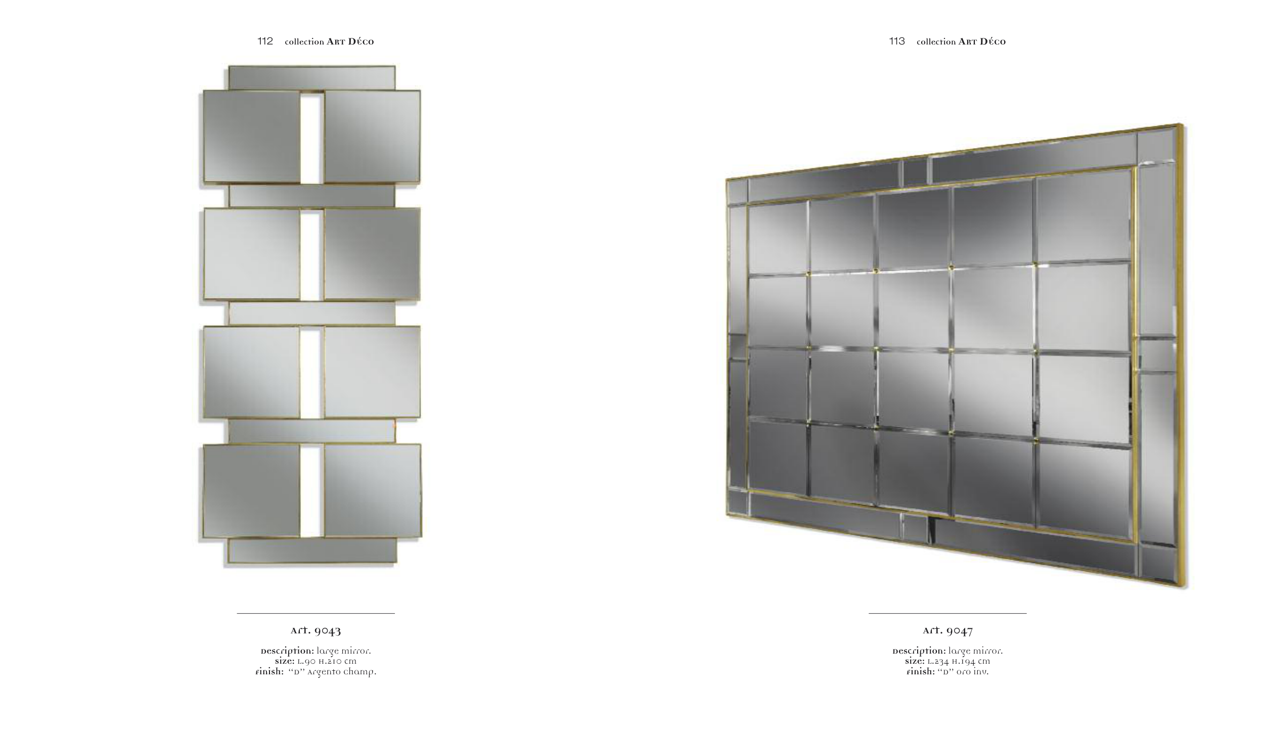 113 collection ART DÉCO Description: large mirror. Size: L.234 H.194 cm Finish: “D” oro inv. Art. 9047 Description: large mirror. Size: L.90 H.210 cm Finish: “D” Argento Champ. Art. 9043 112 collection ART DÉCO