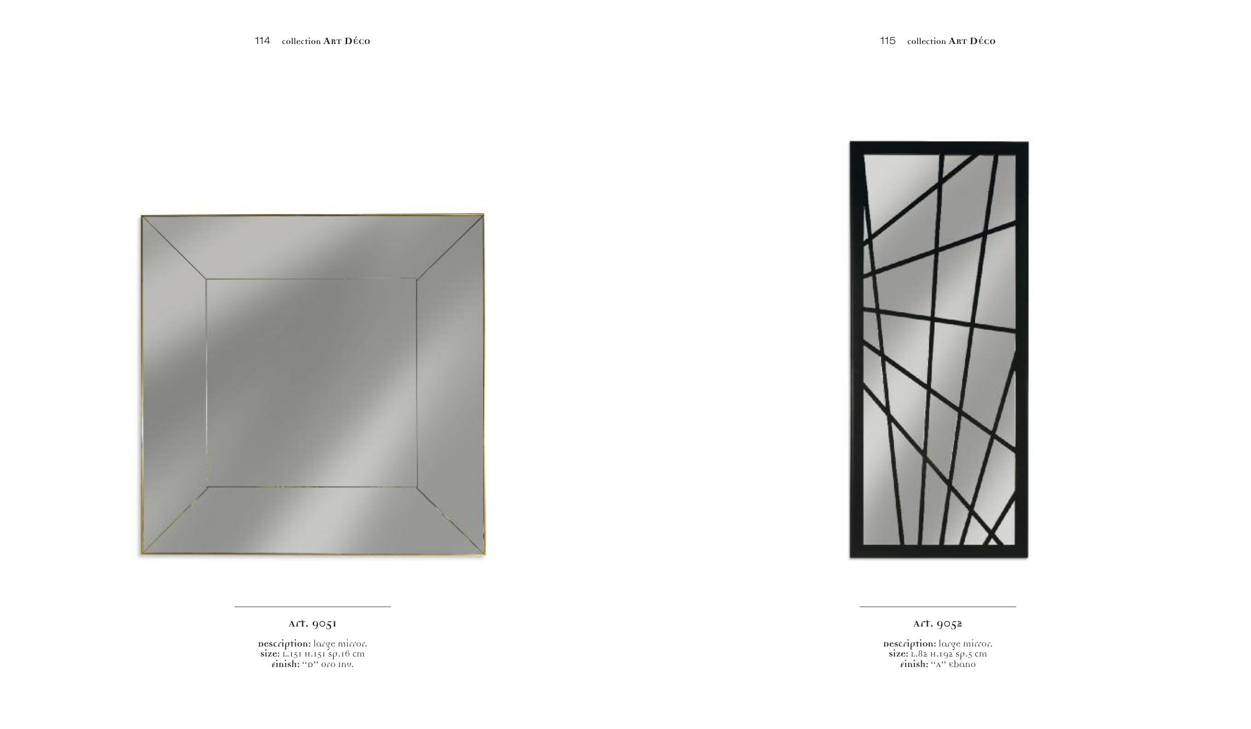 115 collection ART DÉCO Description: large mirror. Size: L.82 H.192 sp.5 cm Finish: “A” Ebano Art. 9052 114 collection ART DÉCO Description: large mirror. Size: L.151 H.151 sp.16 cm Finish: “D” Oro Inv. Art. 9051