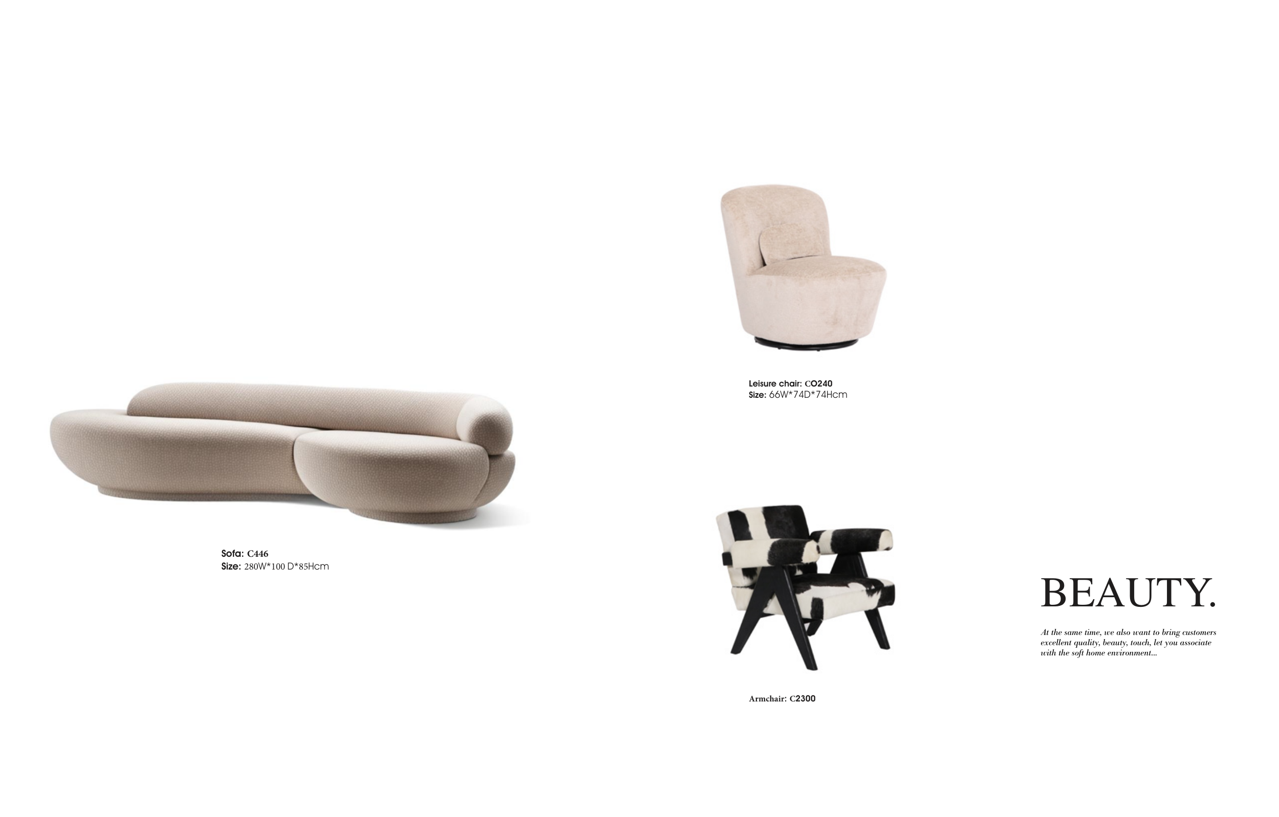 Leisure chair: CO240 Size: 66W*74D*74Hcm Armchair: C2300 At the same time, we also want to bring customers excellent quality, beauty, touch, let you associate with the soft home environment... BEAUTY. Sofa: C446 Size: 280W*100 D*85Hcm