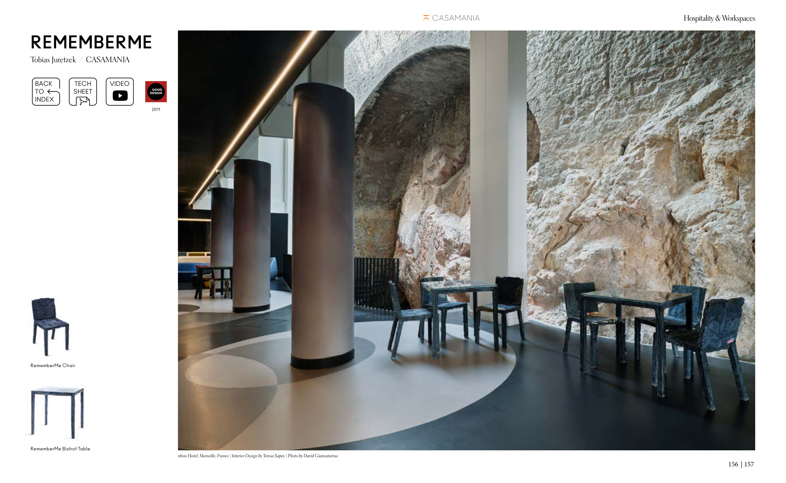 Hospitality & Workspaces 156 | 157 REMEMBERME Tobias Juretzek / CASAMANIA nhow Hotel, Marseille, France | Interior Design by Teresa Sapey | Photo by David Giancatarina RememberMe Chair RememberMe Bistrot Table BACK TO INDEX VIDEO 2011 TECH SHEET