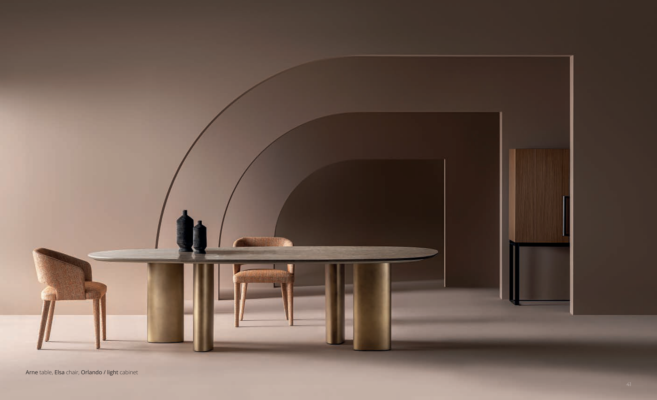 Arne table, Elsa chair, Orlando / light cabinet