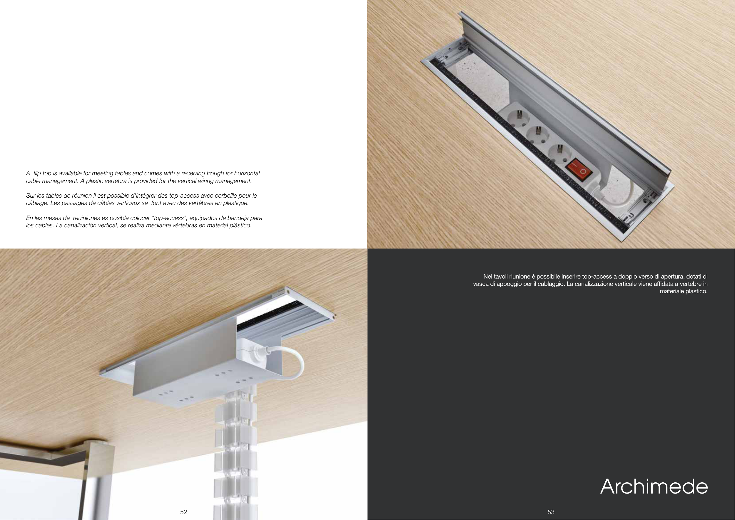 Sur les tables de réunion il est possible d’intégrer des top-access avec corbeille pour le