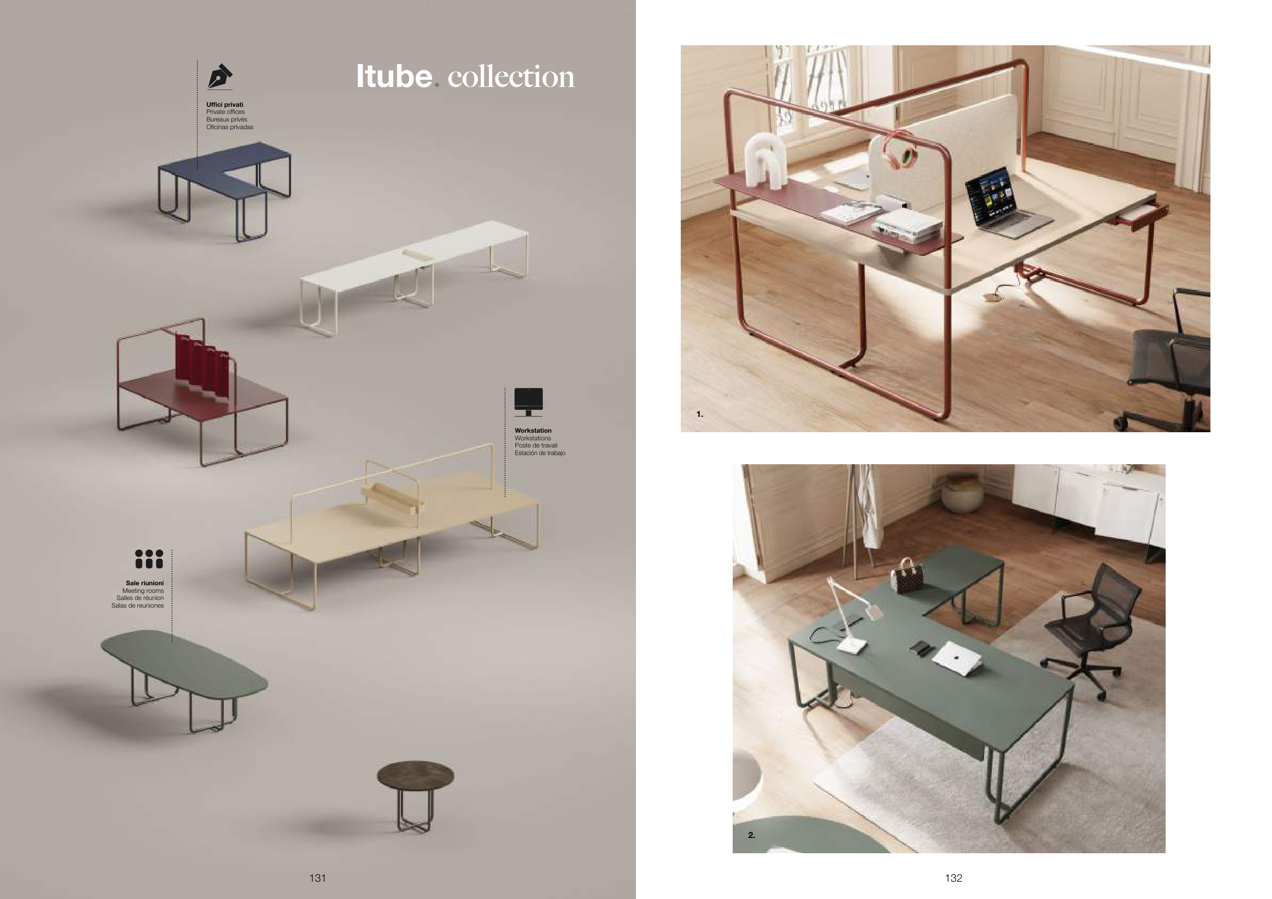 Itube. collection Sale riunioni Meeting rooms Salles de réunion Salas de reuniones Workstation Workstations Poste de travail Estación de trabajo Uffici privati Private offices Bureaux privés Oficinas privadas 131 132 1. 2.