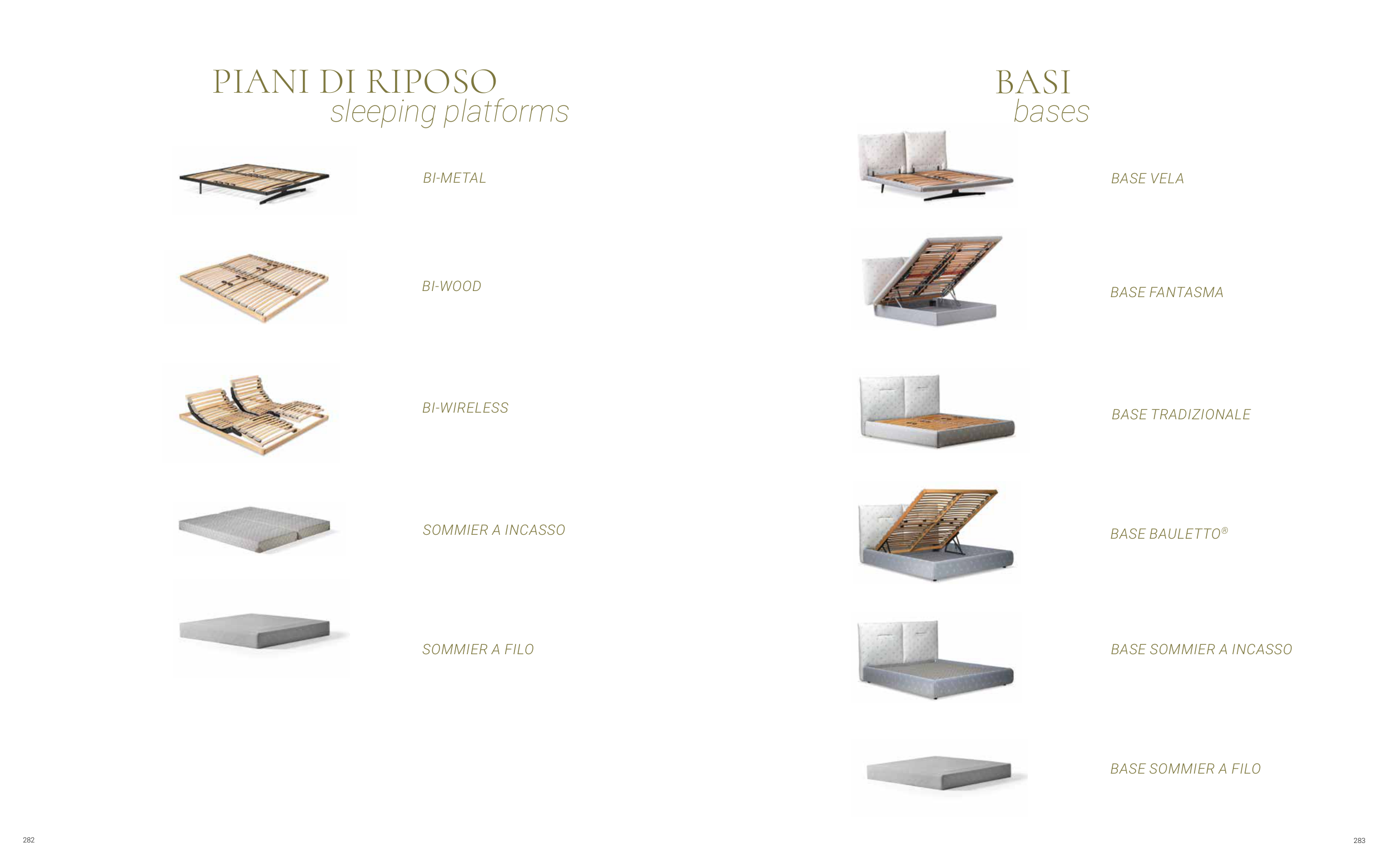 BASI BASE VELA BASE FANTASMA BASE SOMMIER A INCASSO BASE SOMMIER A FILO BASE TRADIZIONALE BASE BAULETTO® bases PIANI DI RIPOSO BI-WOOD BI-METAL BI-WIRELESS SOMMIER A INCASSO SOMMIER A FILO sleeping platforms 283 282
