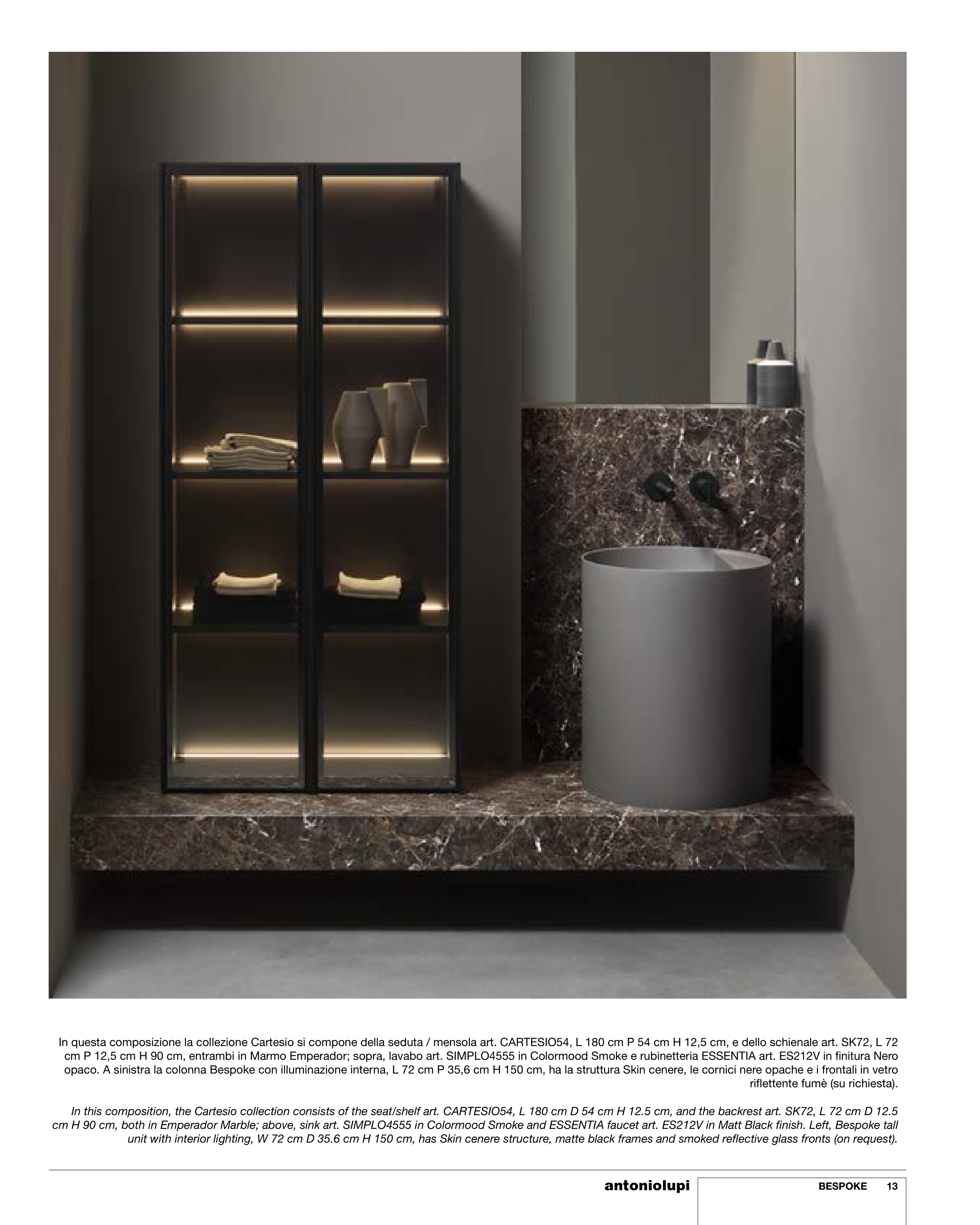 cm H 90 cm, both in Emperador Marble; above, sink art. SIMPLO4555 in Colormood Smoke and ESSENTIA faucet art. ES212V in Matt Black finish. Left, Bespoke tall
