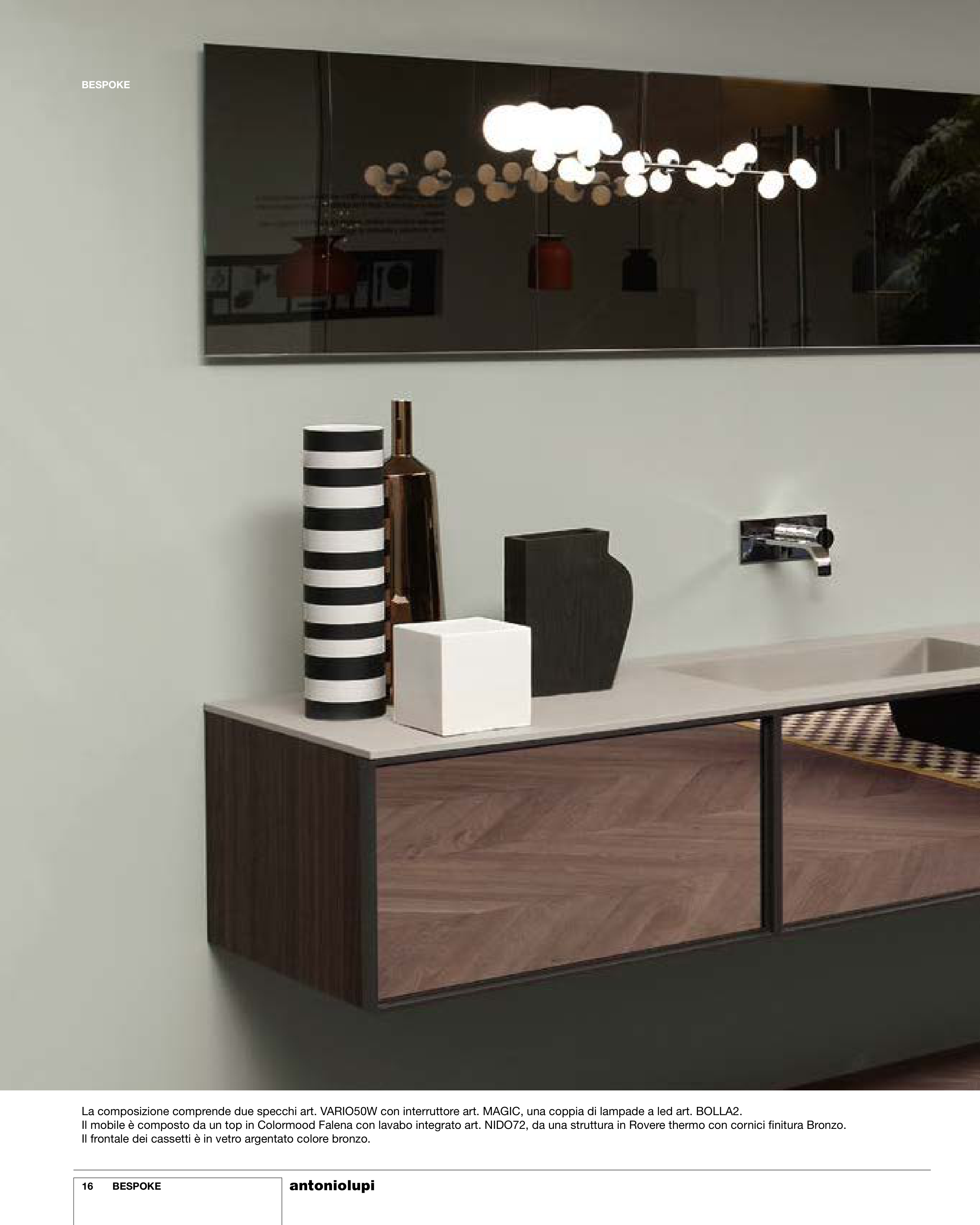 La composizione comprende due specchi art. VARIO50W con interruttore art. MAGIC, una coppia di lampade a led art. BOLLA2.