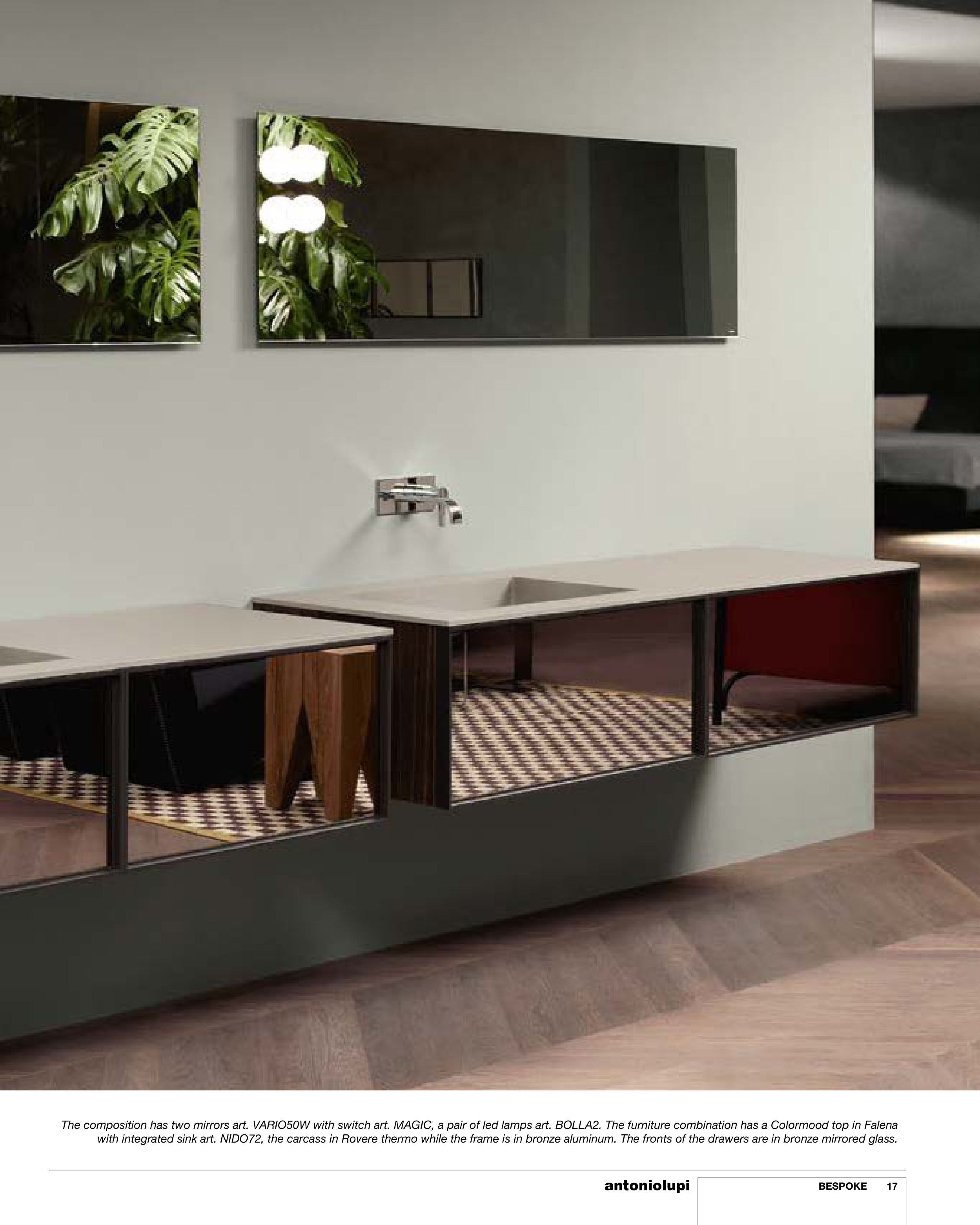 The composition has two mirrors art. VARIO50W with switch art. MAGIC, a pair of led lamps art. BOLLA2. The furniture combination has a Colormood top in Falena