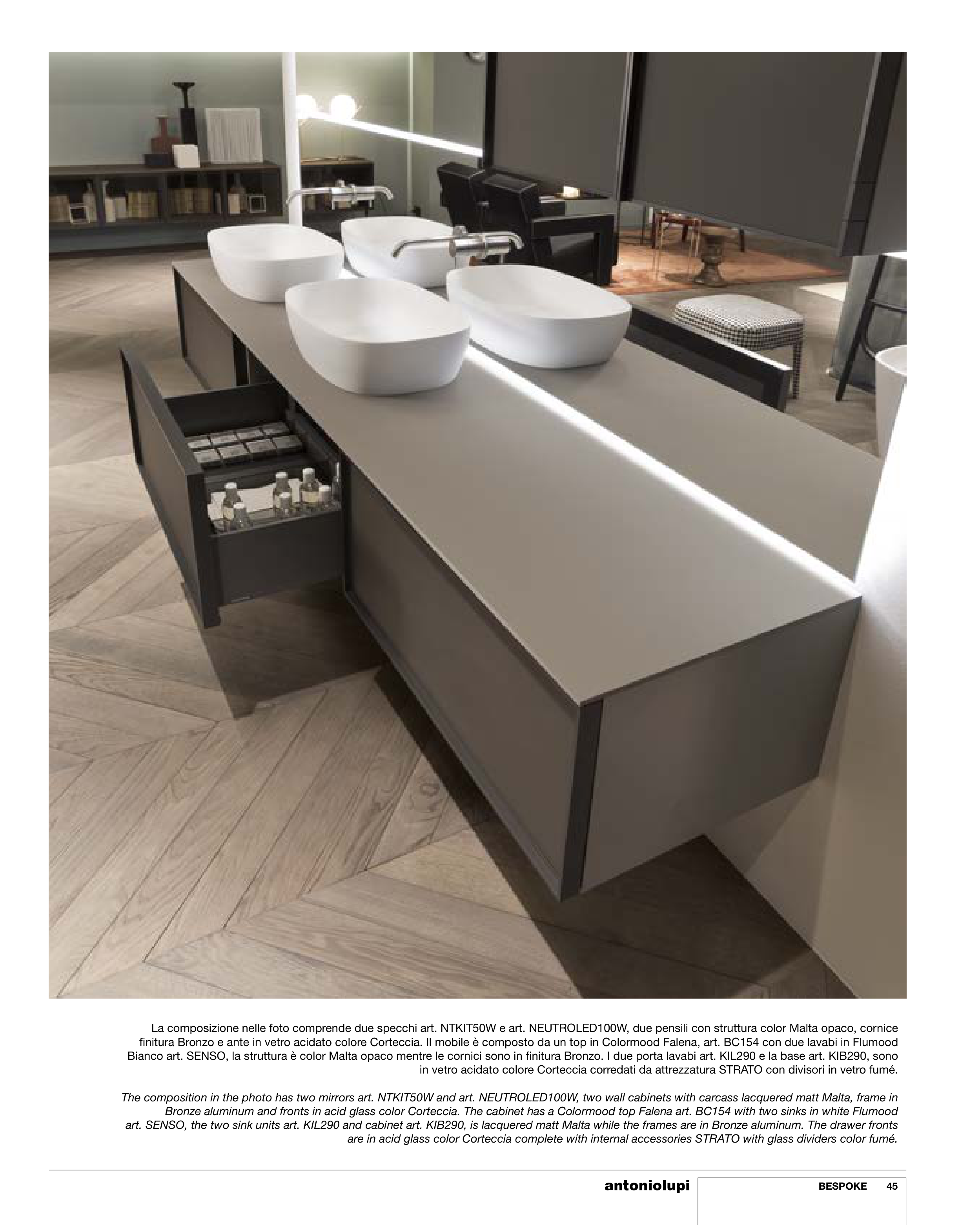 art. SENSO, the two sink units art. KIL290 and cabinet art. KIB290, is lacquered matt Malta while the frames are in Bronze aluminum. The drawer fronts