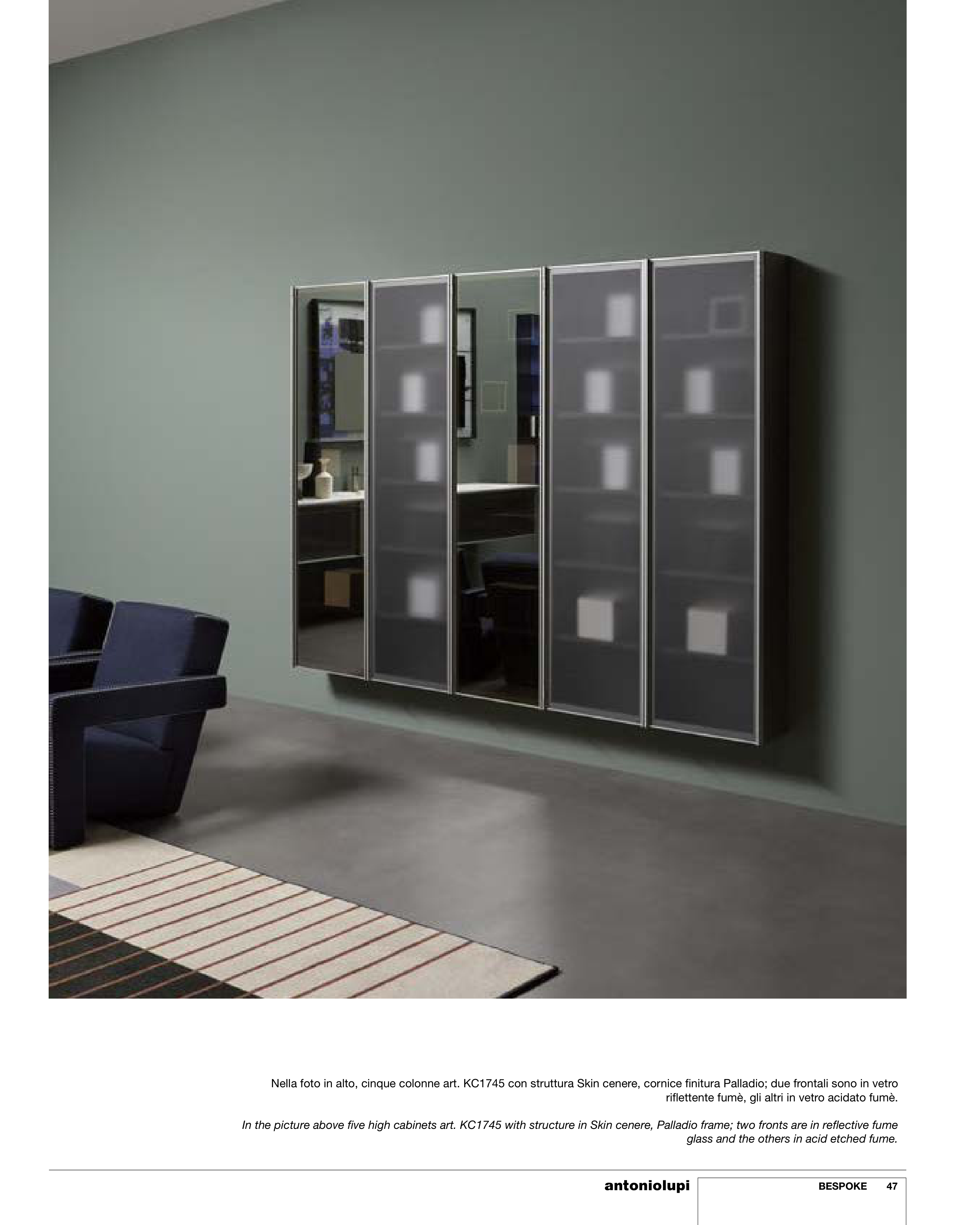 In the picture above five high cabinets art. KC1745 with structure in Skin cenere, Palladio frame; two fronts are in reflective fume