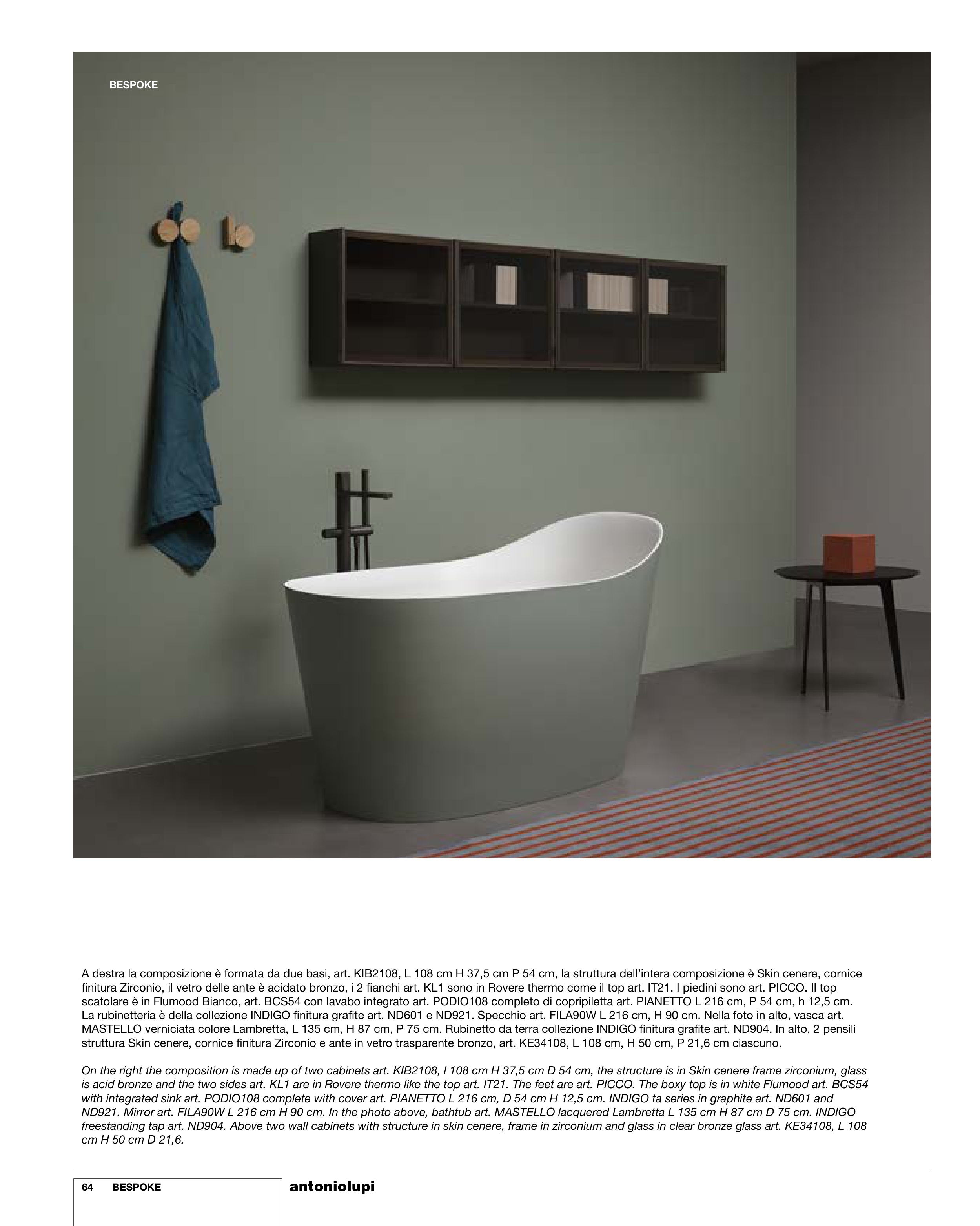 freestanding tap art. ND904. Above two wall cabinets with structure in skin cenere, frame in zirconium and glass in clear bronze glass art. KE34108, L 108