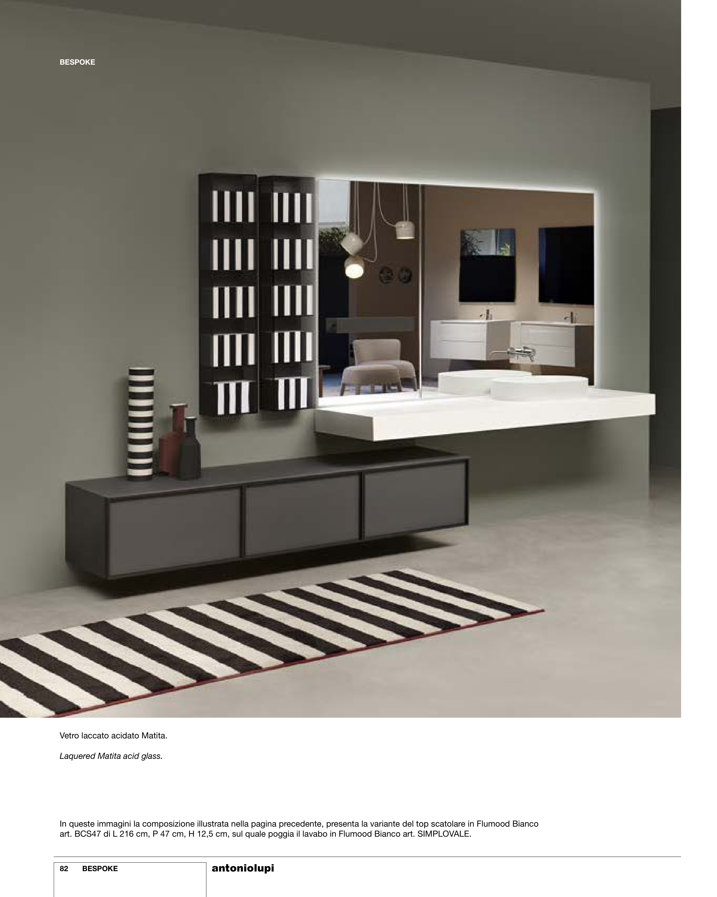 art. BCS47 di L 216 cm, P 47 cm, H 12,5 cm, sul quale poggia il lavabo in Flumood Bianco art. SIMPLOVALE.
